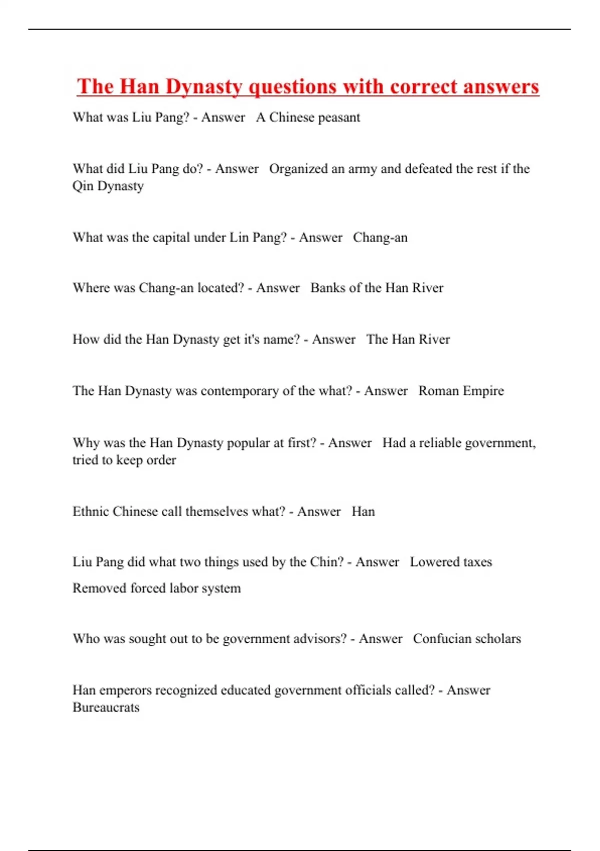 What was Liu Pang? - Answer A Chinese peasant What did Liu Pang do? - Answer Organized an army and defeated the rest if the Qin Dynasty What was the capital under Lin Pang? - Answer Chang-an Where was Chang-an located? - Answer Banks of the Han River How did the Han Dynasty get it's name? - Answer The Han River The Han Dynasty was contemporary of the what? - Answer Roman Empire Why was the Han Dynasty popular at first? - Answer Had a reliable government, tried to keep order Ethnic Chinese call themselves what?