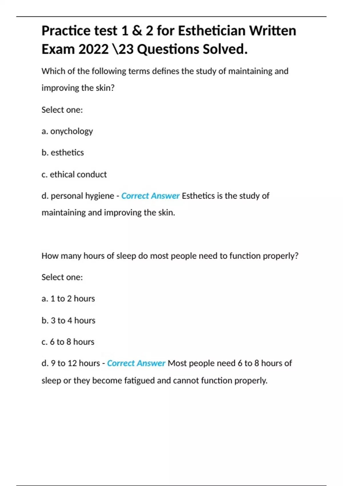 Practice test 1 & 2 for Esthetician Written Exam 2022 23 Questions Solved.