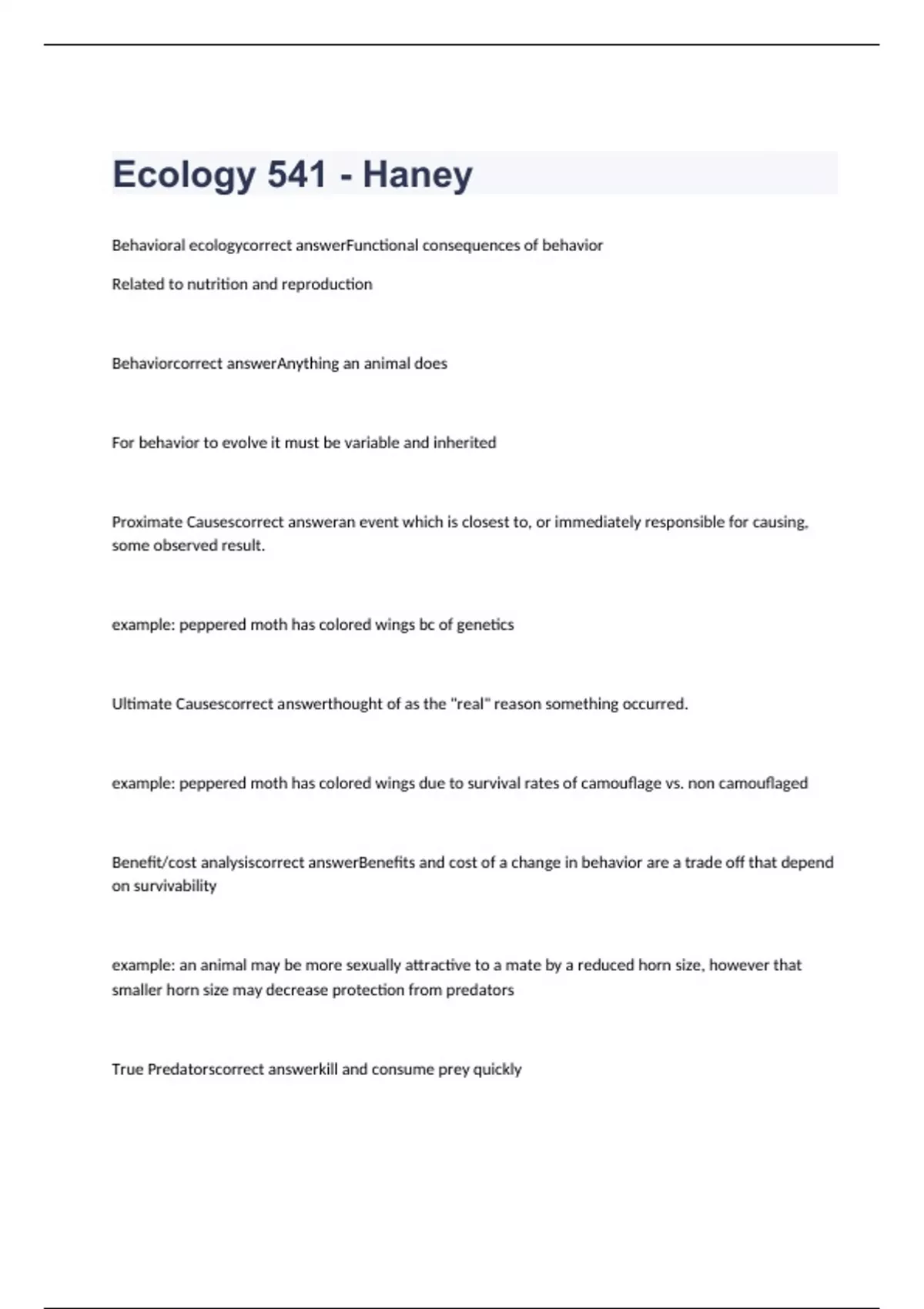 Behavioral ecology Functional consequences of behavior Related to nutrition and reproduction Behavior Anything an animal does For behavior to evolve it must be variable and inherited Proximate Causes an event which is closest to, or immediately responsible for causing, some observed result. example: peppered moth has colored wings bc of genetics Ultimate Causes thought of as the "real" reason something occurred. example: peppered moth has colored wings due to survival rates of camouflage vs. non camouflaged Benefit/cost analysis Benefits and cost of a change in behavior are a trade off that depend on survivability example: an animal may be more sexually attractive to a mate by a reduced horn size, however that smaller horn size may decrease protection from predators True Predators kill and consume prey quickly Grazers Only eat part of preys, harm but do not kill Parasites live on or in the organisms they consume Parasitoids organisms that lay eggs inside other organisms example: glamerata wasp places eggs in caterpillar and they live off that boy, nasty af optimal foraging theory Views foraging behavior as a compromise between benefits of nutrition and costs of obtaining food. Search for food is only worth as much energy, dont spend more energy than food is worth or ya doomed Dumb moose stuff Moose feed on fish rather than vegitation for sodium bc sodium good for buffering of blood, homeostasis of bodily fluids, hair production, nerve transmission, reproduction, lactation Vegetation is high in energy but low in salt Foraging in groups Often able to find food faster, also allows for protections from predators, such as bird swarms Bees as Social Insects Queen - mate once with multiple drones (thotiana) Drones - sexual males with no stingers (f*ck boys) Workers - sterile females (basically bees need feminism or something) Bee Dance 1) food quality (shares taste) 2) Food quantity (contact & recruit) more workers) 3) Direction of food (orientation on hive) 4) Distance to food (duration of dance) Altruism the belief in or practice of disinterested and selfless concern for the well-being of others. inclusive fitness The total effect an individual has on proliferating its genes by producing its own offspring and by providing aid that enables other close relatives to increase the production of their offspring. Goal of Evolutionary Altruism increase copies of a shared gene Parental Care Any action by which an animal expends energy or assumes risks to benefit its offspring to increase gene pool Patch Distribution distribution of resources Uniform Distribution Distribution where populations are spaced evenly mainly for social relations i guess random distribution organisms arranged in no particular pattern (animals probs like to live without contest but that kind of just my assumption) Growth rate per capita r = birth rate/ death rate Ecology Circle Genetics Physiology Behavior Evolution Umwelt "World Around" Umwelt in ecology means environment Instrumentalism attempt to measure features of the world objectively to minimize bias of human observers Reynolds Number Viscosity of a medium inversely related to size of organism Darwins Finches I mean everyone knows this crap already bc its taught in basically every science class to ever exist but whatever Finch have different beak size bc they fill different niche Polymorphism 2nd form of same species Moths and british pollution Black moth survived while peppered moth died bc black soot laced the trees and black moth had better camouflage Red Queen Hypothesis Evolutionary hypothesis which proposes that organisms must constantly adapt, evolve, and proliferate not merely to gain reproductive advantage, but also simply to survive while pitted against ever-evolving opposing organisms in a constantly changing environment. brood parasitism 1) eviction of nesting female (mafia birds) 2) Removal of eggs 3) Disposal of young (nest farming) organismal ecology The branch of ecology concerned with the morphological, physiological, and behavioral ways in which individual organisms meet the challenges posed by their biotic and abiotic environments. population ecology the study of factors that cause populations to increase or decrease