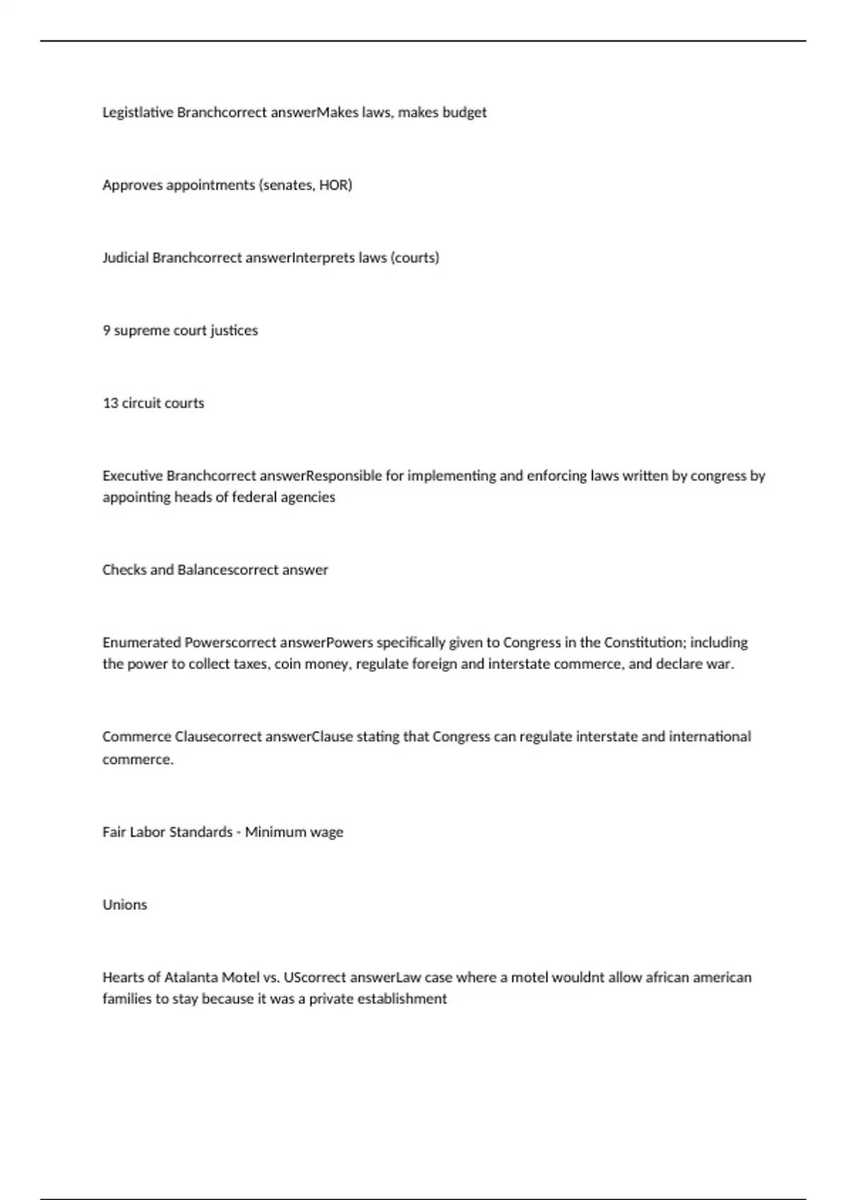 Legistlative Branch Makes laws, makes budget Approves appointments (senates, HOR) Judicial Branch Interprets laws (courts) 9 supreme court justices 13 circuit courts Executive Branch Responsible for implementing and enforcing laws written by congress by appointing heads of federal agencies Checks and Balances Enumerated Powers Powers specifically given to Congress in the Constitution; including the power to collect taxes, coin money, regulate foreign and interstate commerce, and declare war. Commerce Clause Clause stating that Congress can regulate interstate and international commerce. Fair Labor Standards - Minimum wage Unions Hearts of Atalanta Motel vs. US Law case where a motel wouldnt allow african american families to stay because it was a private establishment United States used Commerce Clause stating that this would affect interstate commerce Wickard vs Filburn Increased power of Commerce Clause Government set limit on how much wheat could be grown on a farm with a certain amount of acreage Filburn argued that commerce was not affected bc his wheat was grown for his animals Government said no as this would reduce the amount of wheat bought statewide, thus affecting commerce Legislative Process Law Process President submits a budget request Congress releases its own budget and sets spending levels Subcommittees set funding for individual programs under their oversight through appropriation bill House and Senate resolve any differences between their budget Budget is sent to the President for signature becoming a law Law vs Regulation Laws are made for all programs to uphold, while regulations are only made to be upheld within a certain program NEPA National Environmental Policy Act requires federal agencies to assess the environmental effects of their proposed actions prior to making decisions. making decisions on permit applications, adopting federal land management actions, and constructing highways and other publicly-owned facilities. Consitution Has three main purposes Creates branches of government with checks and balances Creates division of powers for federal and state Protection of personal liberty