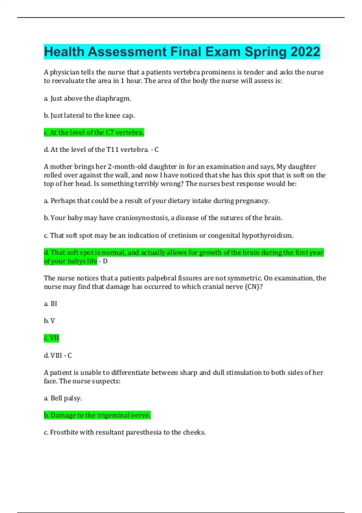 Health Assessment Final Exam Spring 2022