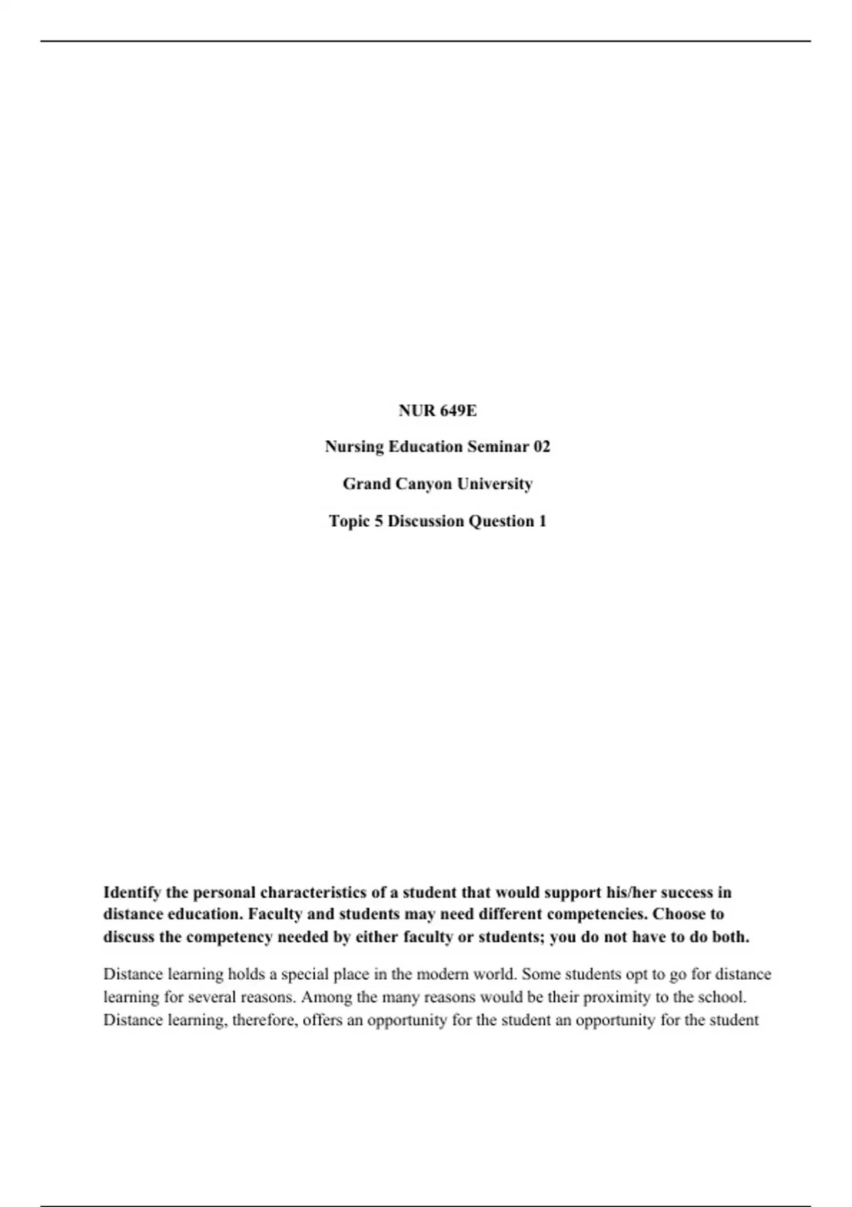 NUR 649E (Nursing Education Seminar 02) Topic 5 Discussion Question 1 Description: Identify the personal characteristics of a student that would support his/her success in distance education. Faculty and students may need different competencies. Choose to discuss the competency needed by either faculty or students; you do not have to do both.
