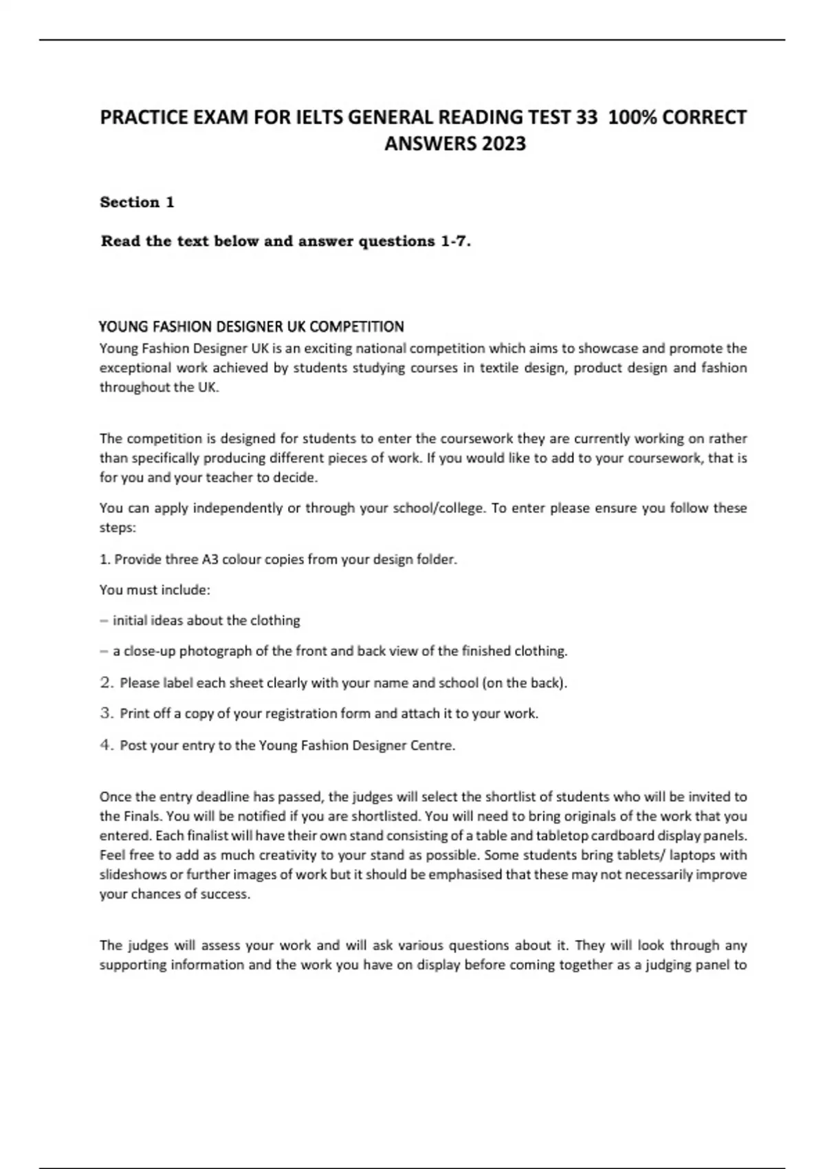 Section 1 Read the text below and answer questions 1-7. YOUNG FASHION DESIGNER UK COMPETITION Young Fashion Designer UK is an exciting national competition which aims to showcase and promote the exceptional work achieved by students studying courses in textile design, product design and fashion throughout the UK. The competition is designed for students to enter the coursework they are currently working on rather than specifically producing different pieces of work. If you would like to add to your coursework, that is for you and your teacher to decide. You can apply independently or through your school/college. To enter please ensure you follow these steps: 1. Provide three A3 colour copies from your design folder. You must include: – initial ideas about the clothing – a close-up photograph of the front and back view of the finished clothing. 2. Please label each sheet clearly with your name and school (on the back). 3. Print off a copy of your registration form and attach it to your work. 4. Post your entry to the Young Fashion Designer Centre. Once the entry deadline has passed, the judges will select the shortlist of students who will be invited to the Finals. You will be notified if you are shortlisted. You will need to bring originals of the work that you entered. Each finalist will have their own stand consisting of a table and tabletop cardboard display panels. Feel free to add as much creativity to your stand as possible. Some students bring tablets/ laptops with slideshows or further images of work but it should be emphasised that these may not necessarily improve your chances of success. The judges will assess your work and will ask various questions about it. They will look through any supporting information and the work you have on display before coming together as a judging panel to
