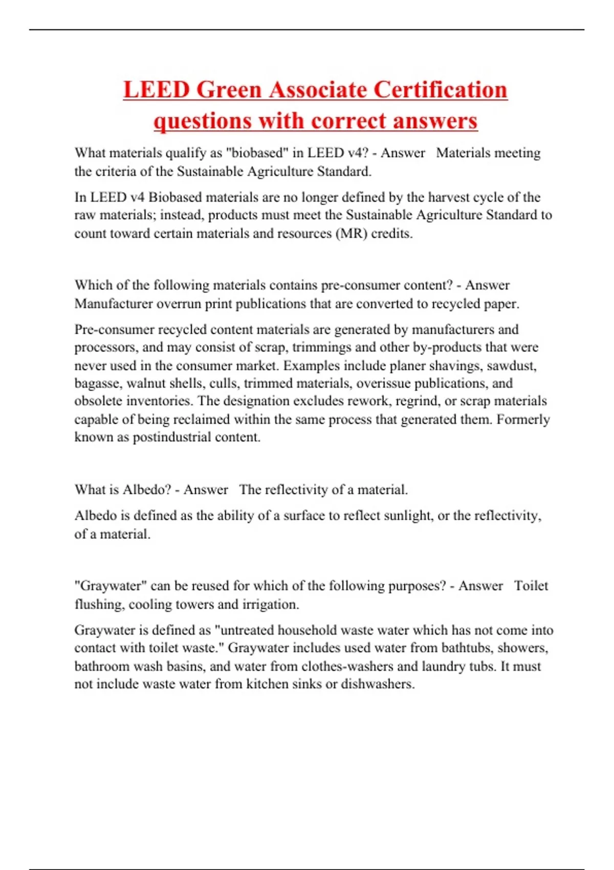 What materials qualify as "biobased" in LEED v4? - Answer Materials meeting the criteria of the Sustainable Agriculture Standard. In LEED v4 Biobased materials are no longer defined by the harvest cycle of the raw materials; instead, products must meet the Sustainable Agriculture Standard to count toward certain materials and resources (MR) credits. Which of the following materials contains pre-consumer content? - Answer Manufacturer overrun print publications that are converted to recycled paper. Pre-consumer recycled content materials are generated by manufacturers and processors, and may consist of scrap, trimmings and other by-products that were never used in the consumer market. Examples include planer shavings, sawdust, bagasse, walnut shells, culls, trimmed materials, overissue publications, and obsolete inventories. The designation excludes rework, regrind, or scrap materials capable of being reclaimed within the same process that generated them. Formerly known as postindustrial content. What is Albedo? - Answer The reflectivity of a material. Albedo is defined as the ability of a surface to reflect sunlight, or the reflectivity, of a material. "Graywater" can be reused for which of the following purposes? - Answer Toilet flushing, cooling towers and irrigation. Graywater is defined as "untreated household waste water which has not come into contact with toilet waste." Graywater includes used water from bathtubs, showers, bathroom wash basins, and water from clothes-washers and laundry tubs. It must not include waste water from kitchen sinks or dishwashers.