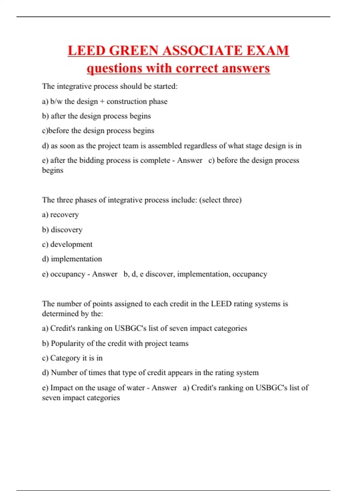 The integrative process should be started: a) b/w the design + construction phase b) after the design process begins c)before the design process begins d) as soon as the project team is assembled regardless of what stage design is in e) after the bidding process is complete - Answer c) before the design process begins The three phases of integrative process include: (select three) a) recovery b) discovery c) development d) implementation e) occupancy - Answer b, d, e discover, implementation, occupancy The number of points assigned to each credit in the LEED rating systems is determined by the: a) Credit's ranking on USBGC's list of seven impact categories b) Popularity of the credit with project teams c) Category it is in d) Number of times that type of credit appears in the rating system e) Impact on the usage of water - Answer a) Credit's ranking on USBGC's list of seven impact categories