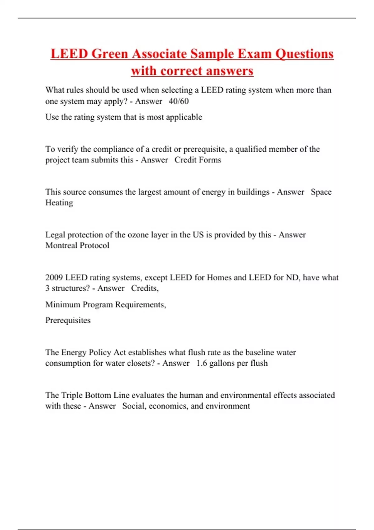 What rules should be used when selecting a LEED rating system when more than one system may apply? - Answer 40/60 Use the rating system that is most applicable To verify the compliance of a credit or prerequisite, a qualified member of the project team submits this - Answer Credit Forms This source consumes the largest amount of energy in buildings - Answer Space Heating Legal protection of the ozone layer in the US is provided by this - Answer Montreal Protocol 2009 LEED rating systems, except LEED for Homes and LEED for ND, have what 3 structures? - Answer Credits, Minimum Program Requirements, Prerequisites The Energy Policy Act establishes what flush rate as the baseline water consumption for water closets? - Answer 1.6 gallons per flush The Triple Bottom Line evaluates the human and environmental effects associated with these - Answer Social, economics, and environment