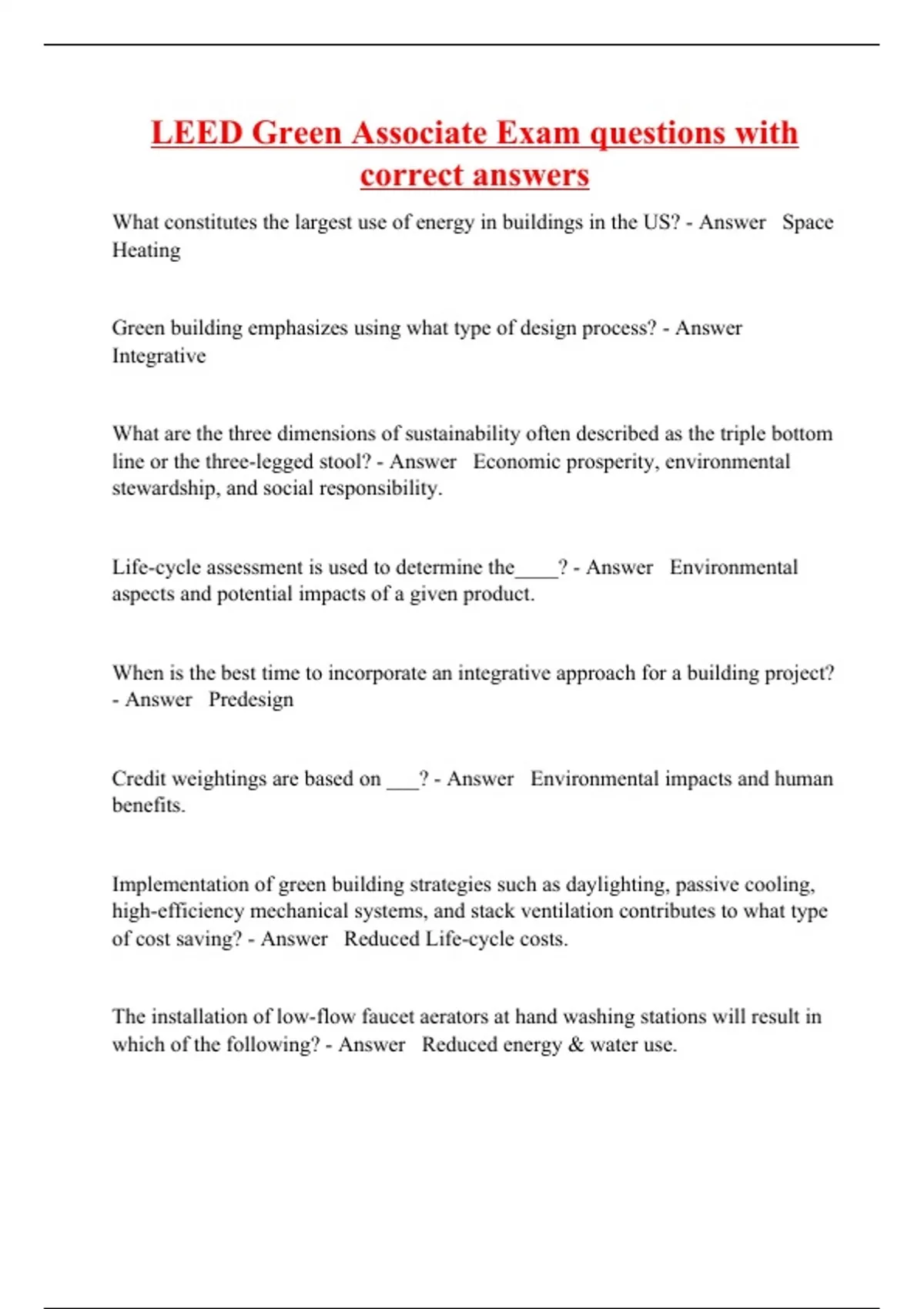 What constitutes the largest use of energy in buildings in the US? - Answer Space Heating Green building emphasizes using what type of design process? - Answer Integrative What are the three dimensions of sustainability often described as the triple bottom line or the three-legged stool? - Answer Economic prosperity, environmental stewardship, and social responsibility. Life-cycle assessment is used to determine the____? - Answer Environmental aspects and potential impacts of a given product. When is the best time to incorporate an integrative approach for a building project? - Answer Predesign Credit weightings are based on ___? - Answer Environmental impacts and human benefits. Implementation of green building strategies such as daylighting, passive cooling, high-efficiency mechanical systems, and stack ventilation contributes to what type of cost saving? - Answer Reduced Life-cycle costs.