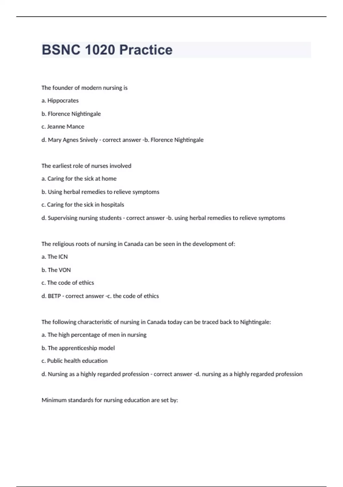 The founder of modern nursing is a. Hippocrates b. Florence Nightingale c. Jeanne Mance d. Mary Agnes Snively b. Florence Nightingale The earliest role of nurses involved a. Caring for the sick at home b. Using herbal remedies to relieve symptoms c. Caring for the sick in hospitals d. Supervising nursing students b. using herbal remedies to relieve symptoms The religious roots of nursing in Canada can be seen in the development of: a. The ICN b. The VON c. The code of ethics d. BETP c. the code of ethics The following characteristic of nursing in Canada today can be traced back to Nightingale: a. The high percentage of men in nursing b. The apprenticeship model c. Public health education d. Nursing as a highly regarded profession d. nursing as a highly regarded profession Minimum standards for nursing education are set by: a. The nursing school b. The provincial regulators and associations c. The Canadian Nurses Association d. The Canadian Nurses Federation b. the provincial regulators and associations Which of the following does not fall under the umbrella of BCCNM standards of practice? a. Code of ethics b. Professional standards c. Practice standards d. Scope of practice a. code of ethics