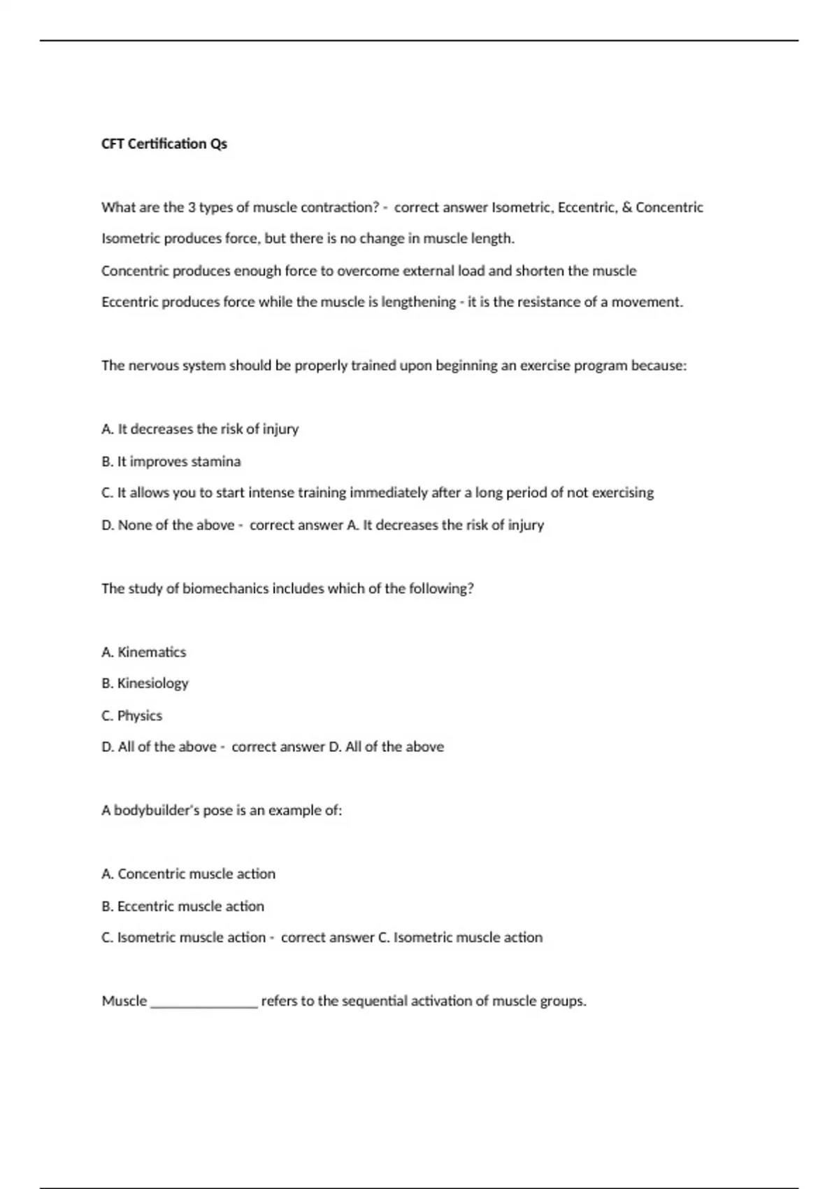 What are the 3 types of muscle contraction? - correct answer Isometric, Eccentric, & Concentric Isometric produces force, but there is no change in muscle length. Concentric produces enough force to overcome external load and shorten the muscle Eccentric produces force while the muscle is lengthening - it is the resistance of a movement. The nervous system should be properly trained upon beginning an exercise program because: A. It decreases the risk of injury B. It improves stamina C. It allows you to start intense training immediately after a long period of not exercising D. None of the above - correct answer A. It decreases the risk of injury The study of biomechanics includes which of the following? A. Kinematics B. Kinesiology C. Physics D. All of the above - correct answer D. All of the above A bodybuilder's pose is an example of: A. Concentric muscle action B. Eccentric muscle action C. Isometric muscle action - correct answer C. Isometric muscle action Muscle ______________ refers to the sequential activation of muscle groups