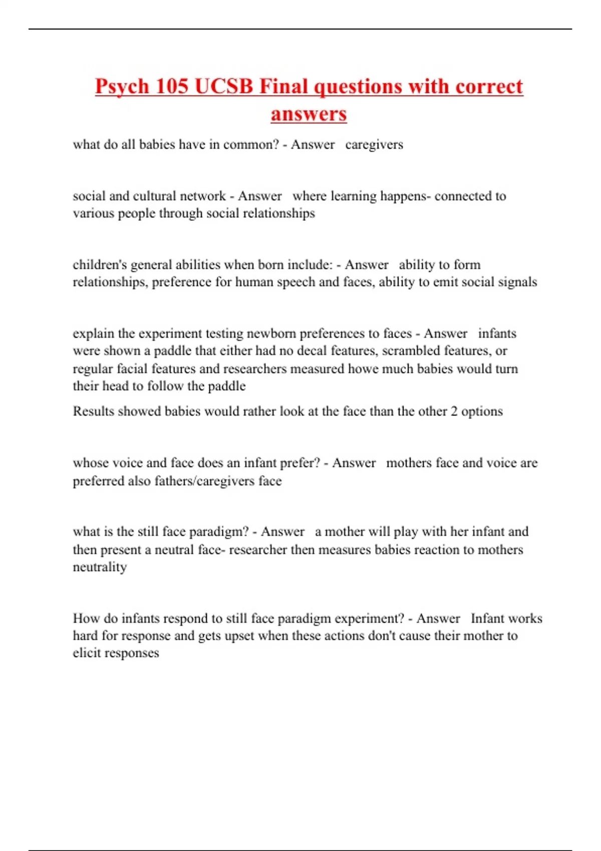 what do all babies have in common? - Answer caregivers social and cultural network - Answer where learning happens- connected to various people through social relationships children's general abilities when born include: - Answer ability to form relationships, preference for human speech and faces, ability to emit social signals explain the experiment testing newborn preferences to faces - Answer infants were shown a paddle that either had no decal features, scrambled features, or regular facial features and researchers measured howe much babies would turn their head to follow the paddle Results showed babies would rather look at the face than the other 2 options whose voice and face does an infant prefer? - Answer mothers face and voice are preferred also fathers/caregivers face what is the still face paradigm? - Answer a mother will play with her infant and then present a neutral face- researcher then measures babies reaction to mothers neutrality How do infants respond to still face paradigm experiment? - Answer Infant works hard for response and gets upset when these actions don't cause their mother to elicit responses