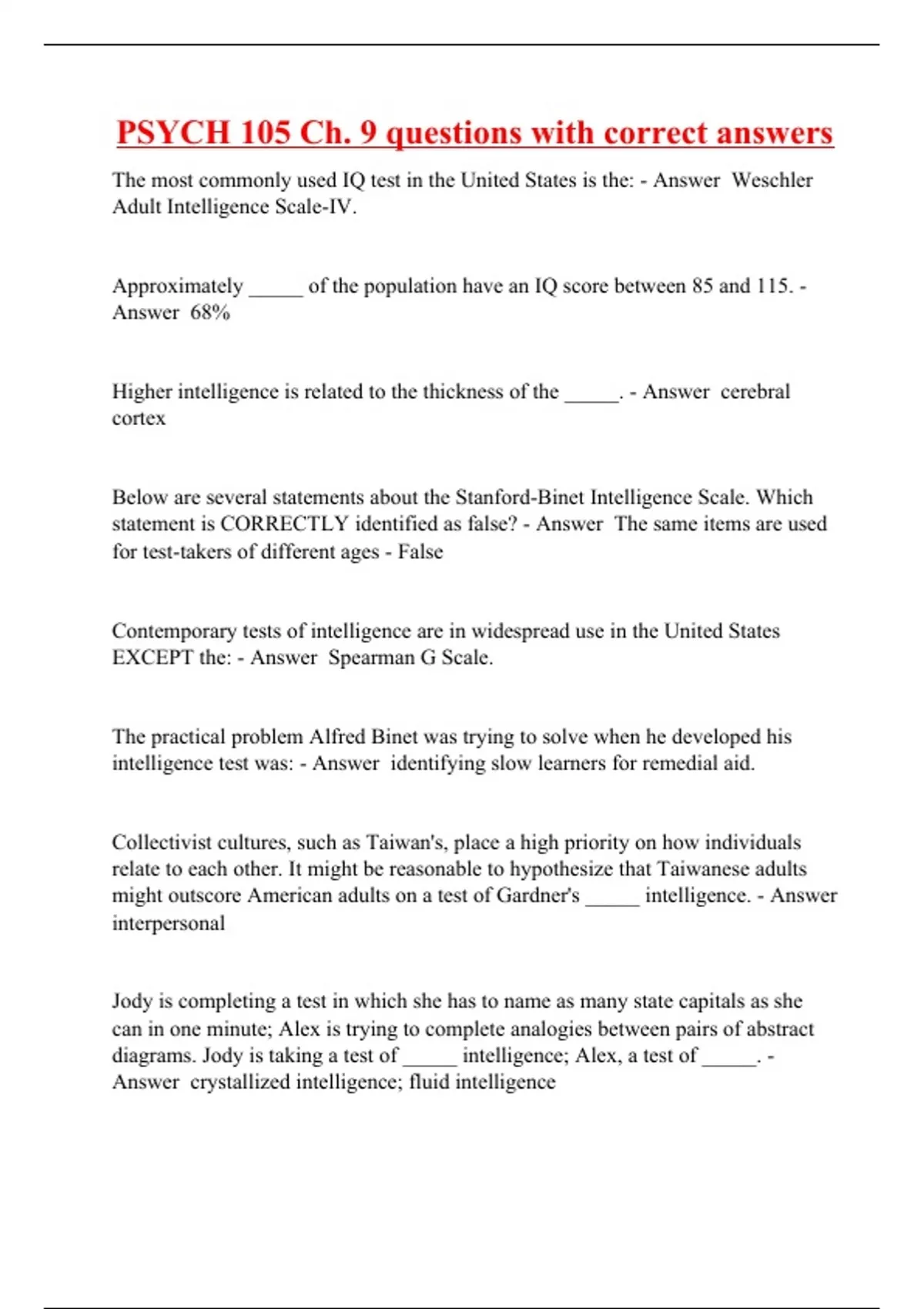 The most commonly used IQ test in the United States is the: - Answer Weschler Adult Intelligence Scale-IV. Approximately _____ of the population have an IQ score between 85 and 115. - Answer 68% Higher intelligence is related to the thickness of the _____. - Answer cerebral cortex Below are several statements about the Stanford-Binet Intelligence Scale. Which statement is CORRECTLY identified as false? - Answer The same items are used for test-takers of different ages - False Contemporary tests of intelligence are in widespread use in the United States EXCEPT the: - Answer Spearman G Scale. The practical problem Alfred Binet was trying to solve when he developed his intelligence test was: - Answer identifying slow learners for remedial aid. Collectivist cultures, such as Taiwan's, place a high priority on how individuals relate to each other. It might be reasonable to hypothesize that Taiwanese adults might outscore American adults on a test of Gardner's _____ intelligence. - Answer interpersonal Jody is completing a test in which she has to name as many state capitals as she can in one minute; Alex is trying to complete analogies between pairs of abstract diagrams. Jody is taking a test of _____ intelligence; Alex, a test of _____. - Answer crystallized intelligence; fluid intelligenc