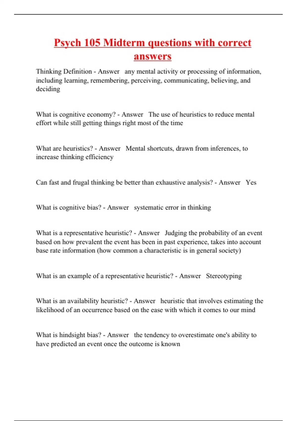 Thinking Definition - Answer any mental activity or processing of information, including learning, remembering, perceiving, communicating, believing, and deciding What is cognitive economy? - Answer The use of heuristics to reduce mental effort while still getting things right most of the time What are heuristics? - Answer Mental shortcuts, drawn from inferences, to increase thinking efficiency Can fast and frugal thinking be better than exhaustive analysis? - Answer Yes What is cognitive bias? - Answer systematic error in thinking What is a representative heuristic? - Answer Judging the probability of an event based on how prevalent the event has been in past experience, takes into account base rate information (how common a characteristic is in general society) What is an example of a representative heuristic? - Answer Stereotyping What is an availability heuristic? - Answer heuristic that involves estimating the likelihood of an occurrence based on the ease with which it comes to our mind What is hindsight bias? - Answer the tendency to overestimate one's ability to have predicted an event once the outcome is known