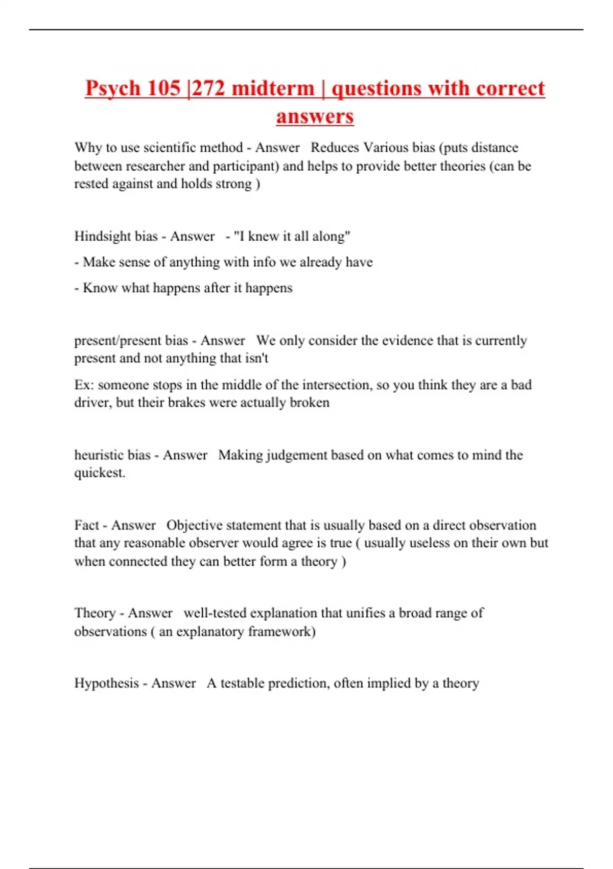 Why to use scientific method - Answer Reduces Various bias (puts distance between researcher and participant) and helps to provide better theories (can be rested against and holds strong ) Hindsight bias - Answer - "I knew it all along" - Make sense of anything with info we already have - Know what happens after it happens present/present bias - Answer We only consider the evidence that is currently present and not anything that isn't Ex: someone stops in the middle of the intersection, so you think they are a bad driver, but their brakes were actually broken heuristic bias - Answer Making judgement based on what comes to mind the quickest. Fact - Answer Objective statement that is usually based on a direct observation that any reasonable observer would agree is true ( usually useless on their own but when connected they can better form a theory ) Theory - Answer well-tested explanation that unifies a broad range of observations ( an explanatory framework) Hypothesis - Answer A testable prediction, often implied by a theory