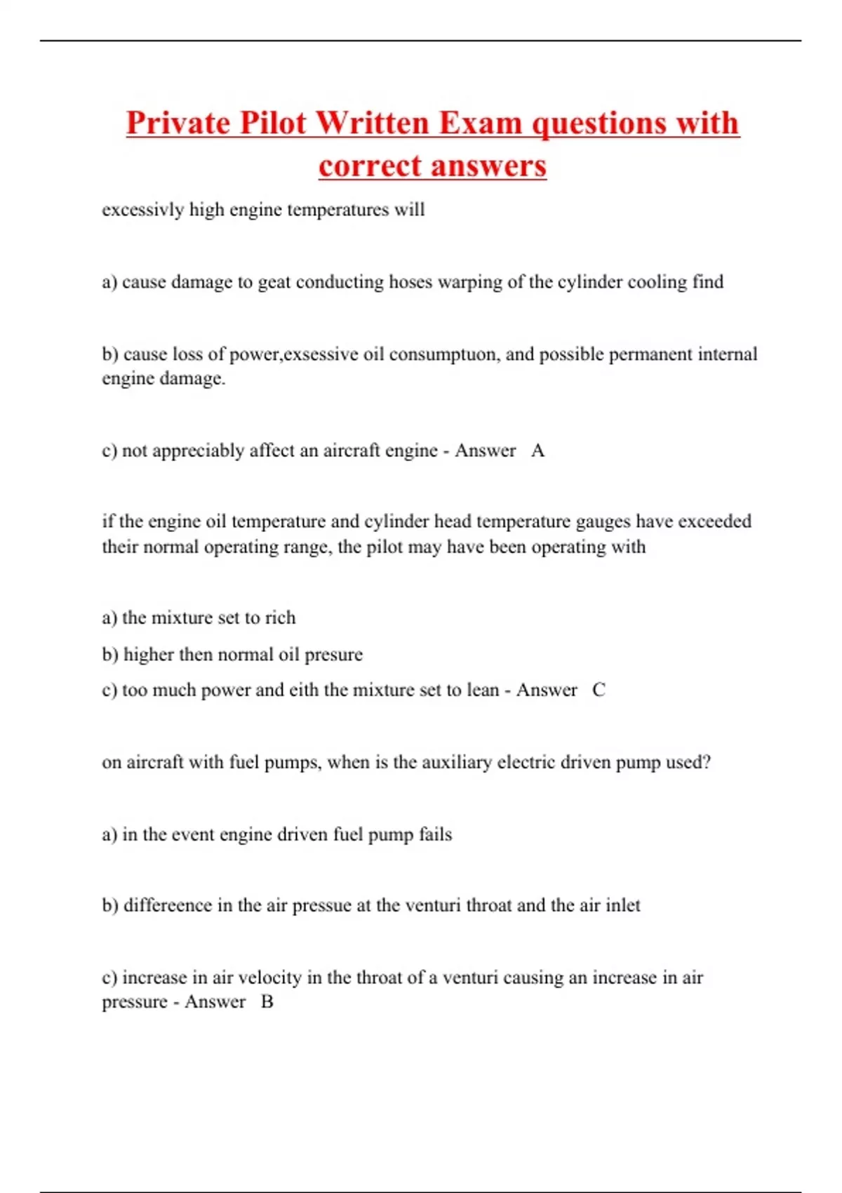 excessivly high engine temperatures will a) cause damage to geat conducting hoses warping of the cylinder cooling find b) cause loss of power,exsessive oil consumptuon, and possible permanent internal engine damage. c) not appreciably affect an aircraft engine - Answer A if the engine oil temperature and cylinder head temperature gauges have exceeded their normal operating range, the pilot may have been operating with a) the mixture set to rich b) higher then normal oil presure c) too much power and eith the mixture set to lean - Answer C on aircraft with fuel pumps, when is the auxiliary electric driven pump used? a) in the event engine driven fuel pump fails b) differeence in the air pressue at the venturi throat and the air inlet c) increase in air velocity in the throat of a venturi causing an increase in air pressure - Answer B