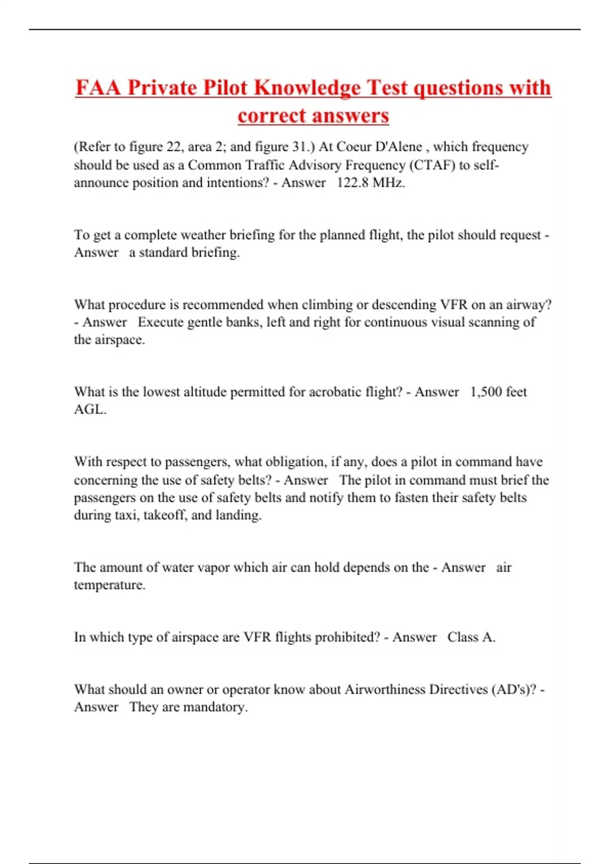 (Refer to figure 22, area 2; and figure 31.) At Coeur D'Alene , which frequency should be used as a Common Traffic Advisory Frequency (CTAF) to self-announce position and intentions? - Answer 122.8 MHz. To get a complete weather briefing for the planned flight, the pilot should request - Answer a standard briefing. What procedure is recommended when climbing or descending VFR on an airway? - Answer Execute gentle banks, left and right for continuous visual scanning of the airspace. What is the lowest altitude permitted for acrobatic flight? - Answer 1,500 feet AGL. With respect to passengers, what obligation, if any, does a pilot in command have concerning the use of safety belts? - Answer The pilot in command must brief the passengers on the use of safety belts and notify them to fasten their safety belts during taxi, takeoff, and landing. The amount of water vapor which air can hold depends on the - Answer air temperature. In which type of airspace are VFR flights prohibited? - Answer Class A. What should an owner or operator know about Airworthiness Directives (AD's)? - Answer They are mandatory.