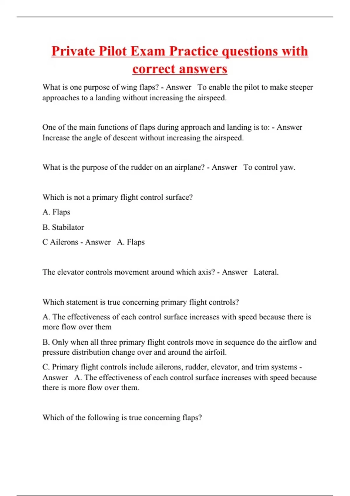 What is one purpose of wing flaps? - Answer To enable the pilot to make steeper approaches to a landing without increasing the airspeed. One of the main functions of flaps during approach and landing is to: - Answer Increase the angle of descent without increasing the airspeed. What is the purpose of the rudder on an airplane? - Answer To control yaw. Which is not a primary flight control surface? A. Flaps B. Stabilator C Ailerons - Answer A. Flaps The elevator controls movement around which axis? - Answer Lateral. Which statement is true concerning primary flight controls? A. The effectiveness of each control surface increases with speed because there is more flow over them B. Only when all three primary flight controls move in sequence do the airflow and pressure distribution change over and around the airfoil. C. Primary flight controls include ailerons, rudder, elevator, and trim systems - Answer A. The effectiveness of each control surface increases with speed because there is more flow over them. Which of the following is true concerning flap