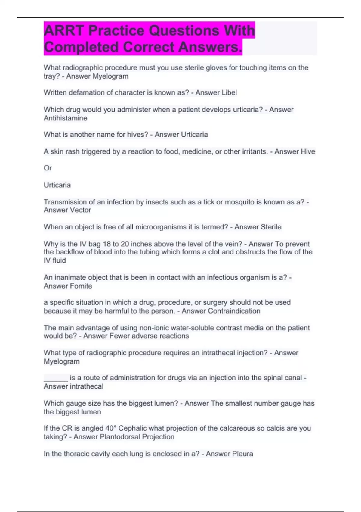 ARRT Practice Questions With Completed Correct Answers.