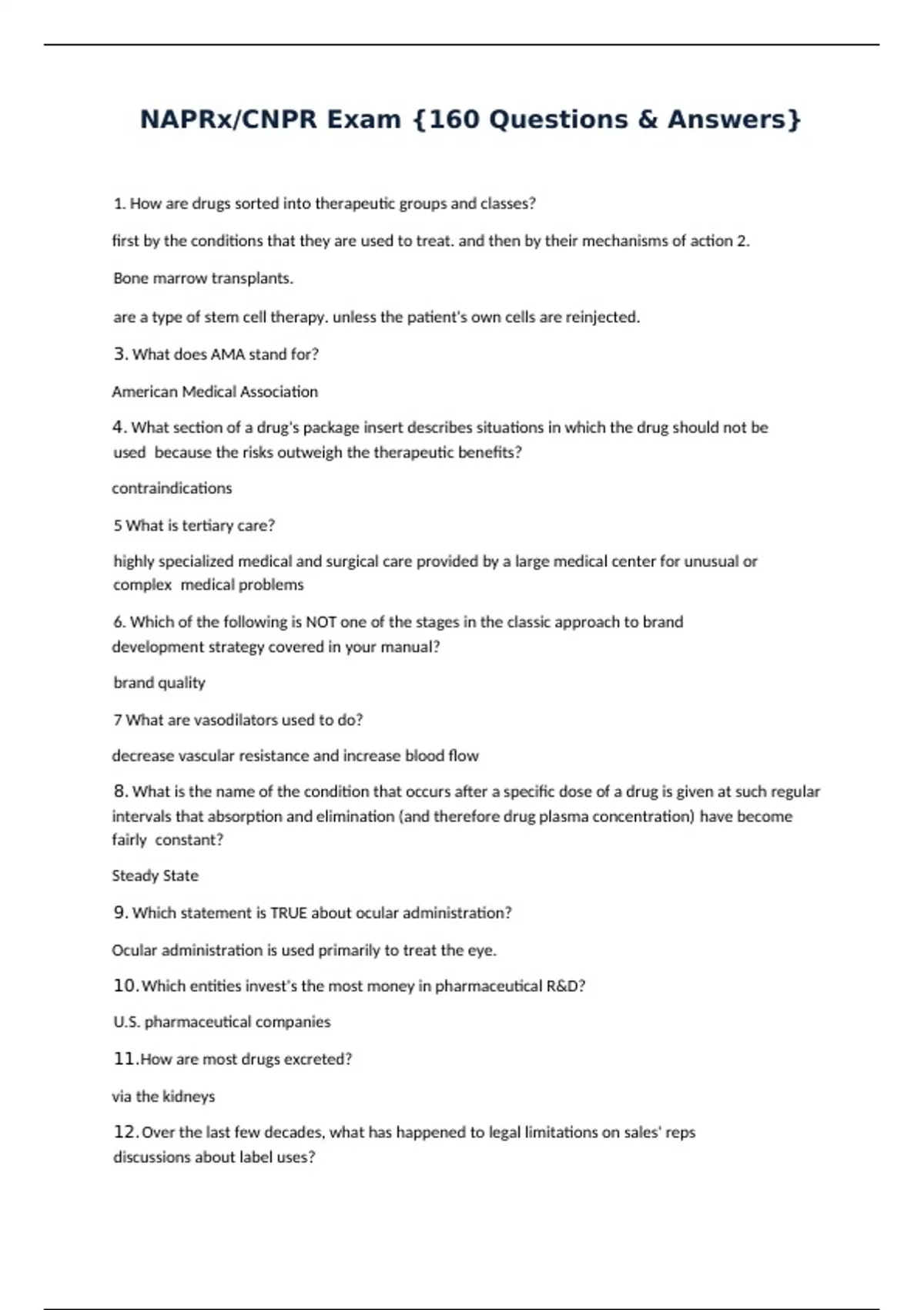 NAPRx/CNPR Exam {160 Questions & Answers} How are drugs sorted into therapeutic groups and classes? first by the conditions that they are used to treat. and then by their mechanisms of action 2. Bone marrow transplants. are a type of stem cell therapy. unless the patient's own cells are reinjected. 3. What does AMA stand for? American Medical Association 4. What section of a drug's package insert describes situations in which the drug should not be used because the risks outweigh the therapeutic benefits? contraindications 5 What is tertiary care? highly specialized medical and surgical care provided by a large medical center for unusual or complex medical problems 6. Which of the following is NOT one of the stages in the classic approach to brand development strategy covered in your manual? brand quality