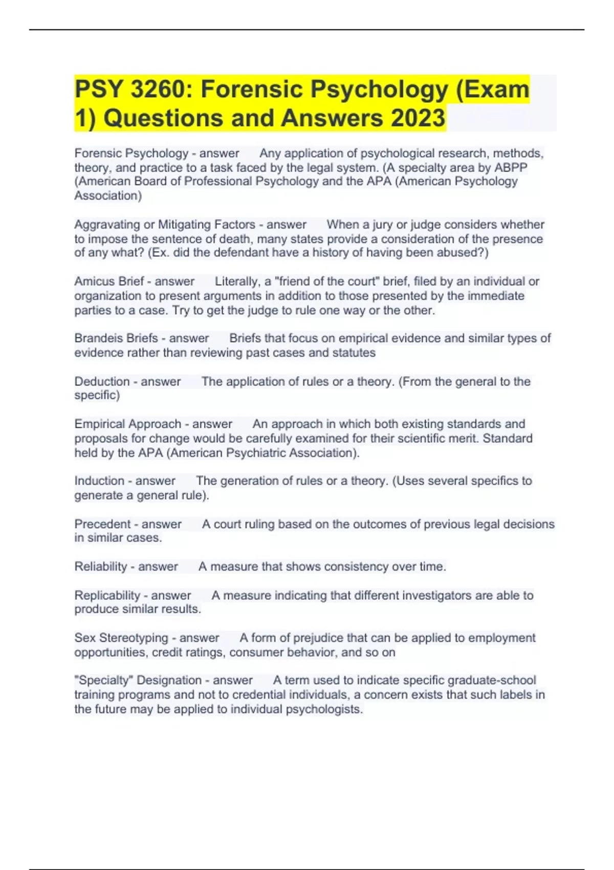 PSY 3260: Forensic Psychology (Exam 1) Questions and Answers 2023