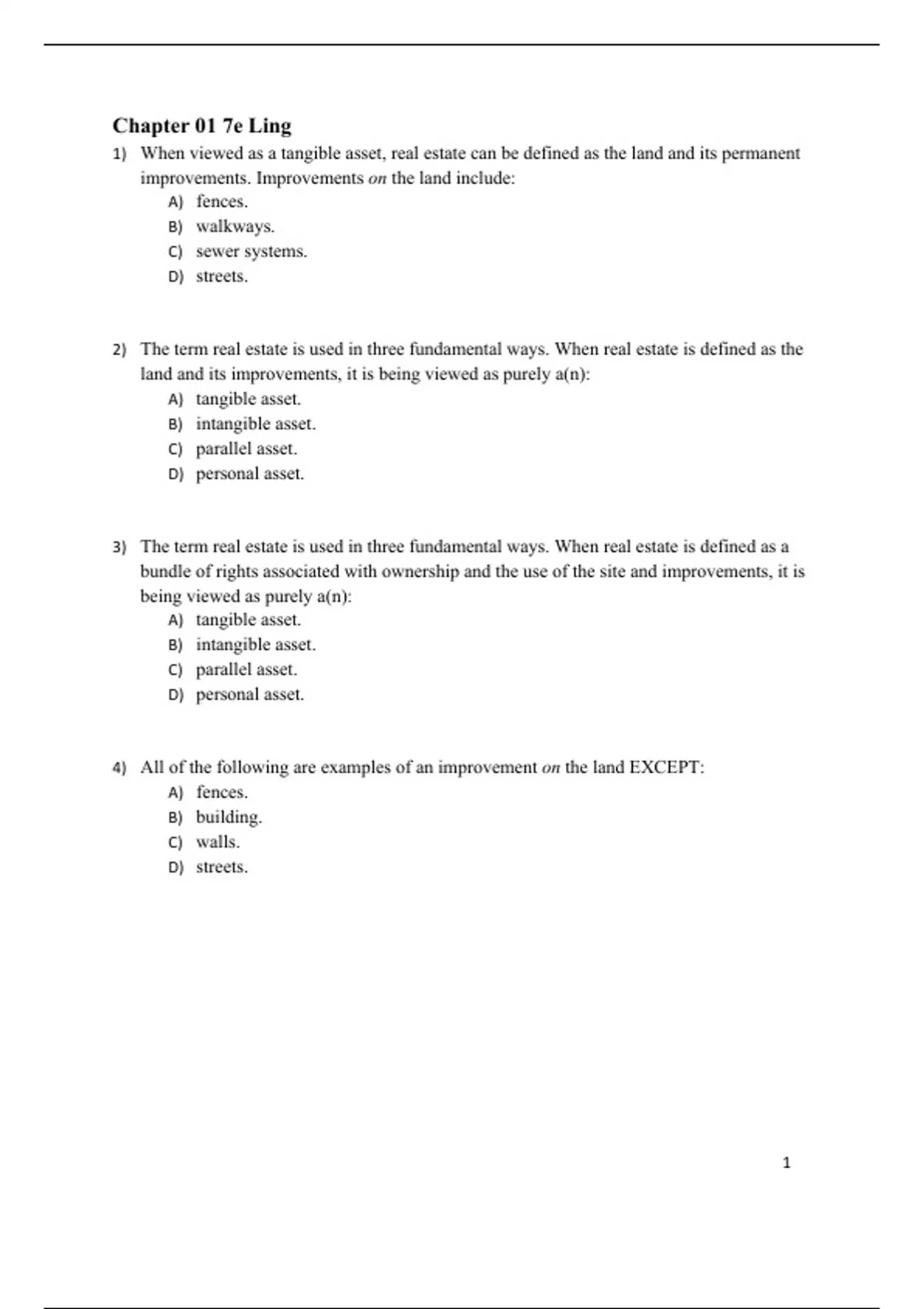 Test Bank for Real Estate Principles: A Value Approach, 7th Edition 7e by David Ling and Wayne Archer. ISBN-13: 0185 Full Chapters test bank are included PART 1: SETTING THE STAGE Chapter 1: The Nature of Real Estate and Real Estate Markets PART 2: LEGAL AND REGULATORY DETERMINANTS OF VALUE Chapter 2: Legal Foundations to Value Chapter 3: Conveying Real Property Interests Chapter 4: Government Controls and Real Estate Markets PART 3: MARKET VALUATION AND APPRAISAL Chapter 5: Market Determinants of Value Chapter 6: Forecasting Ownership Benefits and Value: Market Research Chapter 7: Valuation Using the Sales Comparison and Cost Approaches Chapter 8: Valuation Using the Income Approach PART 4: FINANCING HOME OWNERSHIP Chapter 9: Real Estate Finance: The Laws and Contracts Chapter 10: Residential Mortgage Types and Borrower Decisions Chapter 11: Sources of Funds for Residential Mortgages PART 5: BROKERING AND CLOSING THE TRANSACTION Chapter 12: Real Estate Brokerage and Listing Contracts Chapter 13: Contracts for Sale and Closing PART 6: TIME, OPPORTUNITY COST, AND VALUE DECISIONS Chapter 14: The Effects of Time and Risk on Value Chapter 15: Mortgage Calculations and Decisions PART 7: FINANCING AND INVESTING IN COMMERCIAL REAL ESTATE Chapter 16: Commercial Mortgage Types and Decisions Chapter 17: Sources of Commercial Debt and Equity Capital Chapter 18: Investment Decisions: Ratios Chapter 19: Investment Decisions: NPV and IRR Chapter 20: Income Taxation and Value PART 8: CREATING AND MAINTAINING VALUE Chapter 21: Enhancing Value Through Ongoing Management Chapter 22: Leases and Property Types Chapter 23: Development: The Dynamics of Creating Value