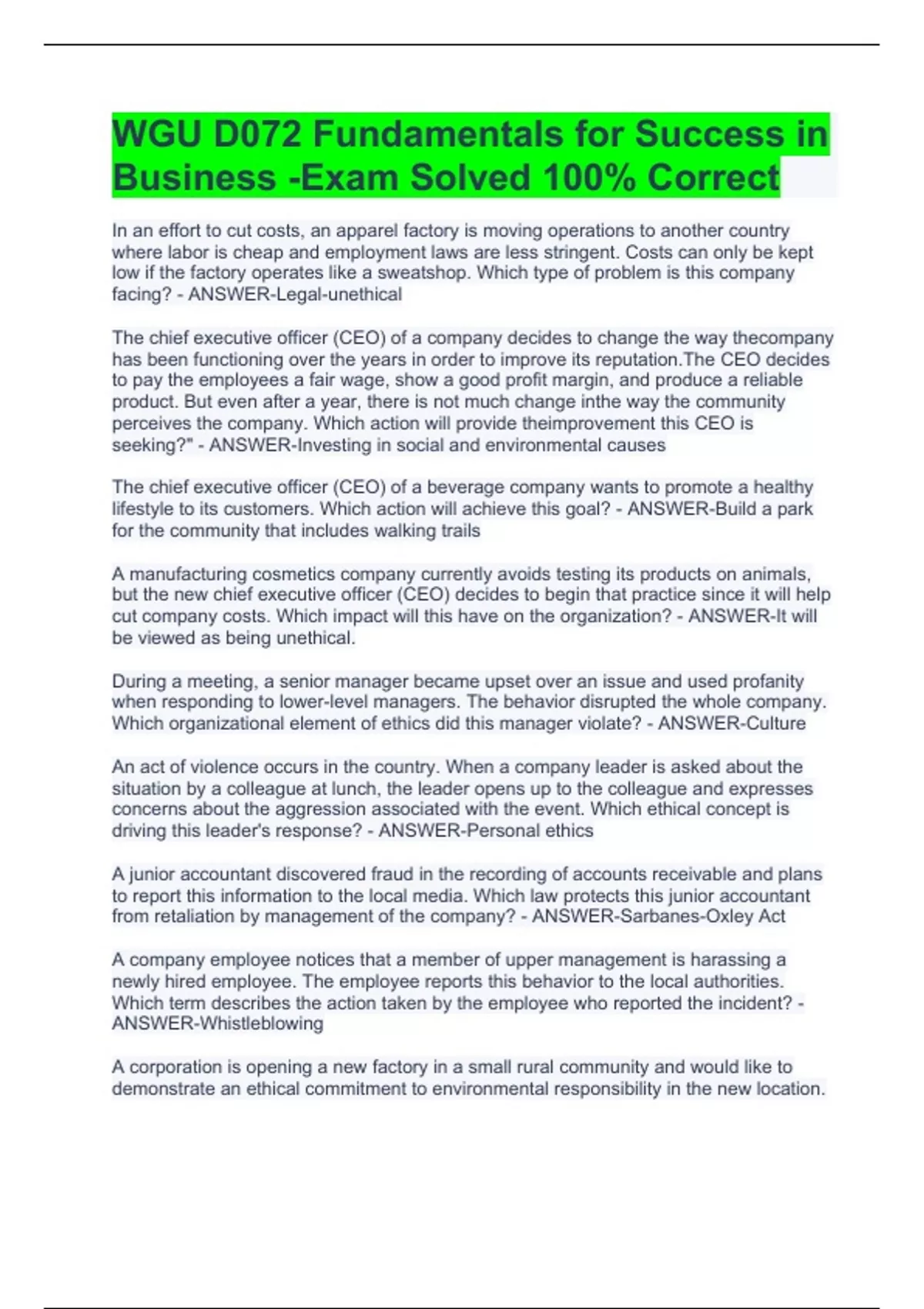 In an effort to cut costs, an apparel factory is moving operations to another country where labor is cheap and employment laws are less stringent. Costs can only be kept low if the factory operates like a sweatshop. Which type of problem is this company facing? - ANSWER-Legal-unethical The chief executive officer (CEO) of a company decides to change the way thecompany has been functioning over the years in order to improve its reputation.The CEO decides to pay the employees a fair wage, show a good profit margin, and produce a reliable product. But even after a year, there is not much change inthe way the community perceives the company. Which action will provide theimprovement this CEO is seeking?" - ANSWER-Investing in social and environmental causes The chief executive officer (CEO) of a beverage company wants to promote a healthy lifestyle to its customers. Which action will achieve this goal? - ANSWER-Build a park for the community that includes walking trails A manufacturing cosmetics company currently avoids testing its products on animals, but the new chief executive officer (CEO) decides to begin that practice since it will help cut company costs. Which impact will this have on the organization? - ANSWER-It will be viewed as being unethical. During a meeting, a senior manager became upset over an issue and used profanity when responding to lower-level managers. The behavior disrupted the whole company. Which organizational element of ethics did this manager violate? - ANSWER-Culture An act of violence occurs in the country. When a company leader is asked about the situation by a colleague at lunch, the leader opens up to the colleague and expresses concerns about the aggression associated with the event. Which ethical concept is driving this leader's response? - ANSWER-Personal ethics A junior accountant discovered fraud in the recording of accounts receivable and plans to report this information to the local media. Which law protects this junior accountant from retaliation by management of the company? - ANSWER-Sarbanes-Oxley Act A company employee notices that a member of upper management is harassing a newly hired employee. The employee reports this behavior to the local authorities. Which term describes the action taken by the employee who reported the incident? - ANSWER-Whistleblowing A corporation is opening a new factory in a small rural community and would like to demonstrate an ethical commitment to environmental responsibility