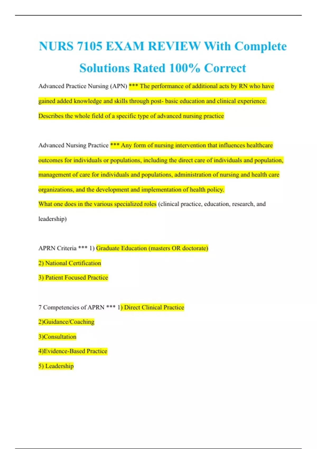 NURS 7105 EXAM REVIEW With Complete Solutions Rated 100% Correct Advanced Practice Nursing (APN) *** The performance of additional acts by RN who have gained added knowledge and skills through post- basic education and clinical experience. Describes the whole field of a specific type of advanced nursing practice Advanced Nursing Practice *** Any form of nursing intervention that influences healthcare outcomes for individuals or populations, including the direct care of individuals and population, management of care for individuals and populations, administration of nursing and health care organizations, and the development and implementation of health policy. What one does in the various specialized roles (clinical practice, education, research, and leadership) APRN Criteria *** 1) Graduate Education (masters OR doctorate) 2) National Certification 3) Patient Focused Practice 7 Competencies of APRN *** 1) Direct Clinical Practice 2)Guidance/Coaching 3)Consultation 4)Evidence-Based Practice 5) Leadership 6) Collaboration 7) Ethical Decision Making Direct Clinical Practice *** Central competency of APRN distinguished by use of a holistic perspective, therapeutic relationship with patient, expert clinical performance, reflective practice, evidence based practice, and use of diverse approaches to health and illness management Scope of Practice *** The legal authority granted to the APRN which varies amongst roles and from state to state DNP *** Highest level of nursing education (i.e. terminal degree). AACN defines as a practice focused doctorate degree. Focus is on expertise in clinical practice. AACN *** Organization responsible for publishing the 8 essentials of DNP curriculum (Essentials of Doctoral Education of Advanced Nursing Practice) APRN Consensus Model *** Proposed regulatory model for advanced practice nursing that defines APRN licensure, accreditation, certification, and education (LACE) Provides guidance for states to adopt uniformity in the regulation of APRN roles NCSBN *** Independent, not-for-profit organization through which boards of nursing act and counsel together on matters of common interest and concern affecting public health, safety, and welfare Has 59 member boards Prescriptive Authority *** Legal authority granted to advanced practice nurses to prescribe medication Collaborative Practice Agreement (CPA) *** Formal agreement addressing the parameters between an APRN and a collaborating physician; approved by LSBN Controlled Substances *** Additional privilege of an APRN not included with prescriptive authority; requires LCDS number + DEA Number Restrictions on Controlled Substances *** APRNs may not prescribe controlled substances in connection with/treatment of: a) chronic pain b) obesity c) oneself, a spouse, child or any other family member 1970s *** Doctorate degrees in nursing emerged AACN Essentials of Doctorate Education for ANP *** I: Scientific Underpinning for Practice II: Organizational and systems leadership for quality improvement and systems thinking III: Clinical scholarship and analytical methods for EBP IV: Information- Systems- Technology and Patient care technology for the improvement of health care V: Healthcare policy for advocacy in health care VI: Interprofessional collaboration for improving patient and population health outcomes. VII: Clinical prevention and population health for improving the nation's health VIII: Advanced Nursing Practice. Focus of the DNP *** Clinical Practice Leadership Health Policy and Advocacy Information Technology 1. Collaboration 2. Credibility 3. Compassion 4. Coordination *** Four C's of Professional Nurse Communications in Health Care Teams Nursing Theory *** Concepts connected by relational statements that describe, predict, or explain phenomena consistent with nursing's perspective. Conceptual Models *** Nursing theory model that communicates knowledge useful to the whole discipline of nursing Grand Theories *** Nursing theory model that is more delimited in scope than conceptual models and tends to focus on developing one aspect of a conceptual model Middle- Range Theories *** Nursing theory model that describes, explains, or predicts concrete and specific phenomena. It is narrower in scope and more amenable to validation through empirical testing, and more immediately applicable to clinical practice. Evidence Based Nursing Practice *** Conscientious integration of best research evidence with clinical expertise and patient values and needs in the delivery of quality, cost- effective health care. Quantitative Research *** Objectivity and use of numerical data to obtain information about the world Qualitative Research *** Use of subjective, interactive approaches to describe life experiences and give meaning to them Scholarship in Nursing *** Those activities that systematically advance the teaching, research, and practice of nursing through rigorous inquiry that: is significant to the profession is creative can be documented can be replicated or elaborated can be peer reviewed through various methods Networking *** Proactive involvement in activities to develop and maintain personal and professional relationships with others for the purpose of mutual benefit in work or career. Six Characteristics of Advanced Direct Care Practice *** 1. Use of holistic perspective 2. Formation of therapeutic partnerships with patients 3. Expert clinical performance 4. Use of reflective practice 5. Use of evidence as a guide to practice 6. Use of diverse approaches to health and illness management CNS *** APRN role that has three spheres: patient/ client, nurses and nursing practice, organization/ system Clinical expert who provides direct care to patients with complex health problems Formal consultants to nursing staff and other care providers within the organization NP *** APRN role that possesses advanced health assessment, diagnostic, and clinical management skills, including pharmacology management Expert direct care to pa
