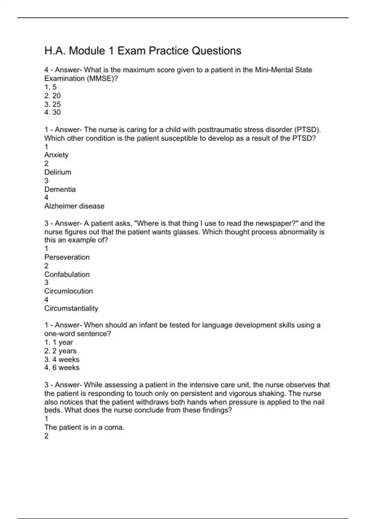 4 - Answer- What is the maximum score given to a patient in the Mini-Mental State Examination (MMSE)? 1. 5 2. 20 3. 25 4. 30 1 - Answer- The nurse is caring for a child with posttraumatic stress disorder (PTSD). Which other condition is the patient susceptible to develop as a result of the PTSD? 1 Anxiety 2 Delirium 3 Dementia 4 Alzheimer disease 3 - Answer- A patient asks, "Where is that thing I use to read the newspaper?" and the nurse figures out that the patient wants glasses. Which thought process abnormality is this an example of? 1 Perseveration 2 Confabulation 3 Circumlocution 4 Circumstantiality 1 - Answer- When should an infant be tested for language development skills using a one-word sentence? 1. 1 year 2. 2 years 3. 4 weeks 4. 6 weeks 3 - Answer- While assessing a patient in the intensive care unit, the nurse observes that the patient is responding to touch only on persistent and vigorous shaking. The nurse also notices that the patient withdraws both hands when pressure is applied to the nail beds. What does the nurse conclude from these findings? 1 The patient is in a coma. 2 The