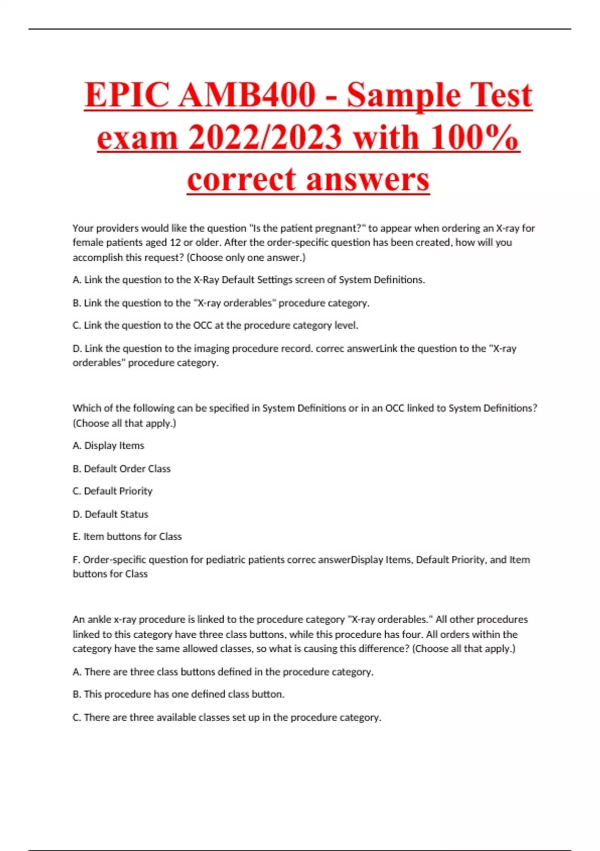 EPIC AMB400 - Sample Test exam 2022/2023 with 100% correct answers Your providers would like the question "Is the patient pregnant?" to appear when ordering an X-ray for female patients aged 12 or older. After the order-specific question has been created, how will you accomplish this request? (Choose only one answer.) A. Link the question to the X-Ray Default Settings screen of System Definitions. B. Link the question to the