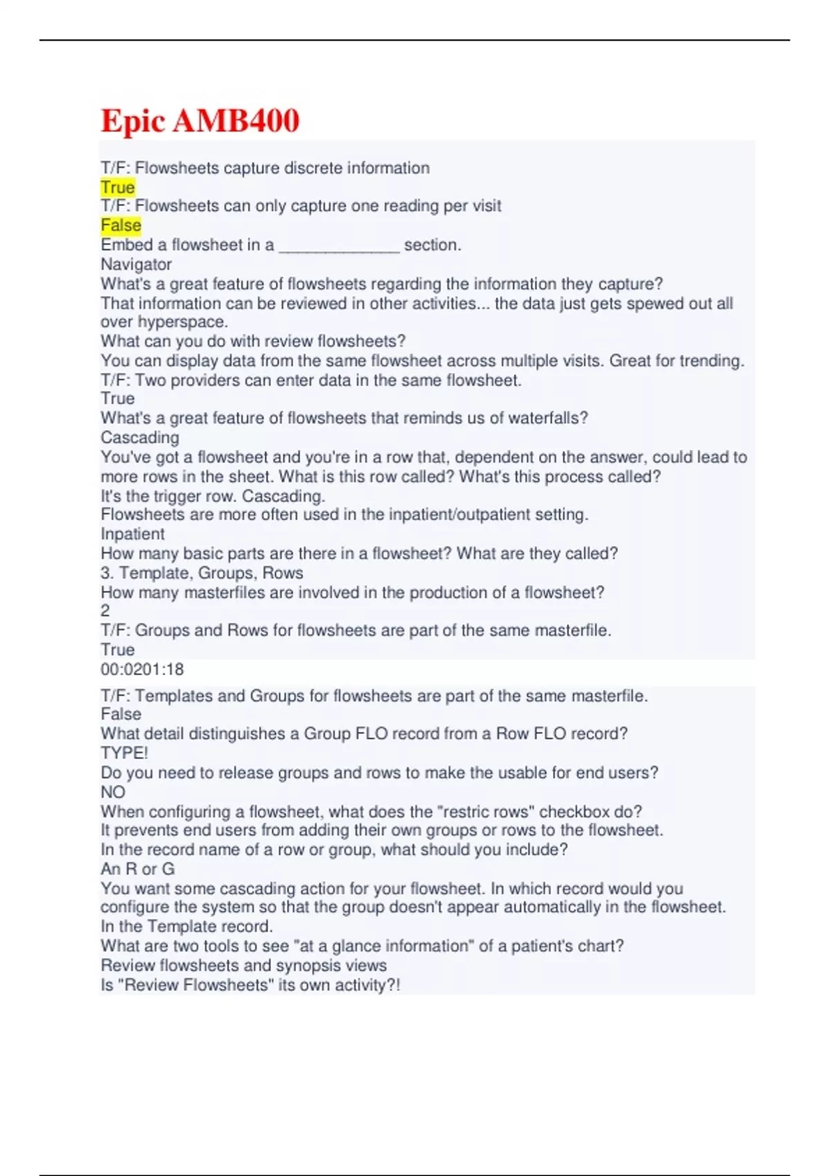 Epic AMB400 EXAM 2022/2023 WITH 100% CORRECT ANSWERS T/F: Flowsheets capture discrete information True T/F: Flowsheets can only capture one reading per visit False Embed a flowsheet in a _____________ section. Navigator What's a great feature of flowsheets regarding the information they capture? That information can be reviewed in other activities... the data just gets spewed out all over hyperspace. What can you do with review flowsheets? You can display data from the same flowsheet across multiple visits. Great for trending. T/F: Two providers can enter data in the same flowsheet. True What's a great feature of flowsheets that reminds us of waterfalls? Cascading You've got a flowsheet and you're in a row that, dependent on the answer, could lead to more rows in the sheet. What is this row called? What's this process called? It's the trigger row. Cascading. Flowsheets are more often used in the inpatient/outpatient setting. Inpatient How many basic parts are there in a flowsheet? What are they called? 3. Template, Groups, Rows How many masterfiles are involved in the production of a flowsheet? 2 T/F: Groups and Rows for flowsheets are part of the same masterfile. True T/F: Templates and Groups for flowsheets are part of the same masterfile. False