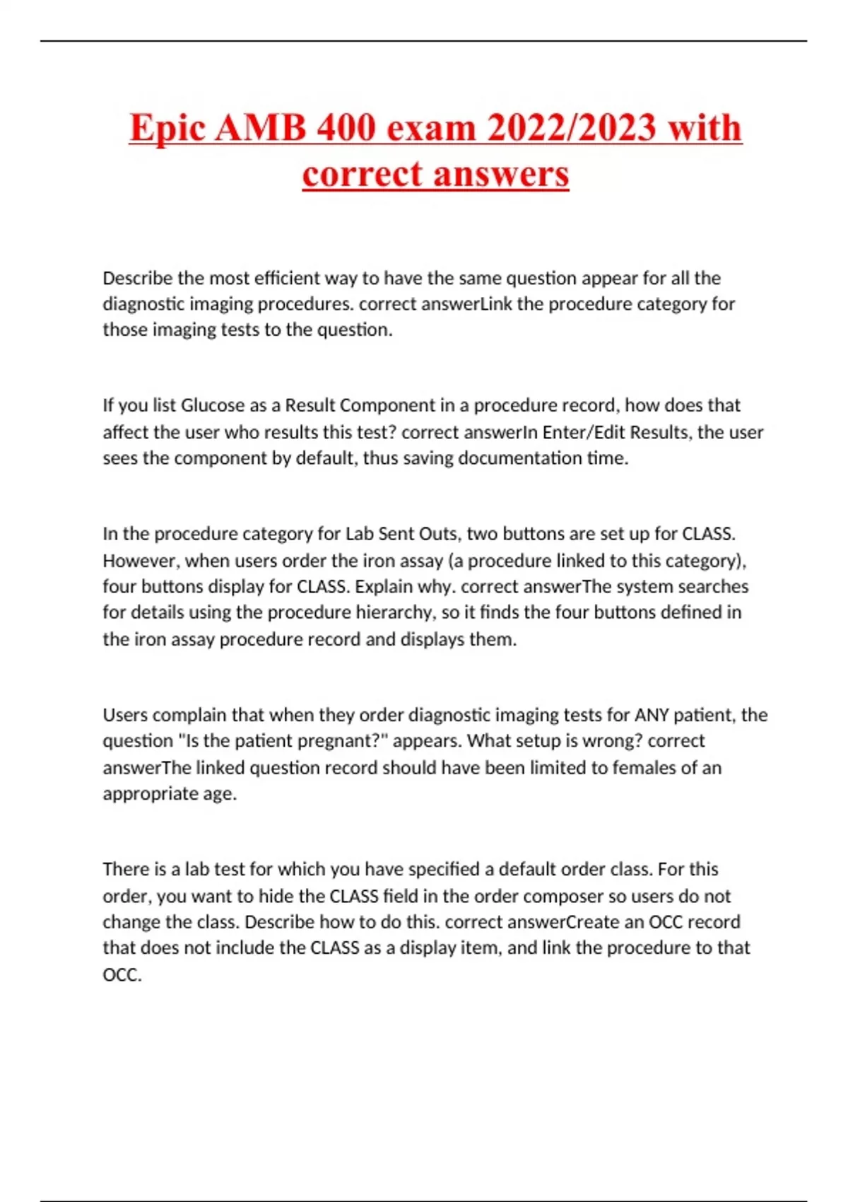 Epic AMB 400 exam 2022/2023 with correct answers Describe the most efficient way to have the same question appear for all the diagnostic imaging procedures. Link the procedure category for those imaging tests to the question. If you list Glucose as a Result Component in a procedure record, how does that affect the user who results this test? In Enter/Edit Results, the user sees the component by default, thus saving documentation time. In the procedure category for Lab Sent Outs, two buttons are set up for CLASS. However, when users order the iron assay (a procedure linked to this category), four buttons display for CLASS. Explain why. The system searches for details using the procedure hierarchy, so it finds the four buttons defined in the iron assay procedure record and displays them. Users complain that when they order diagnostic imaging tests for ANY patient, the question