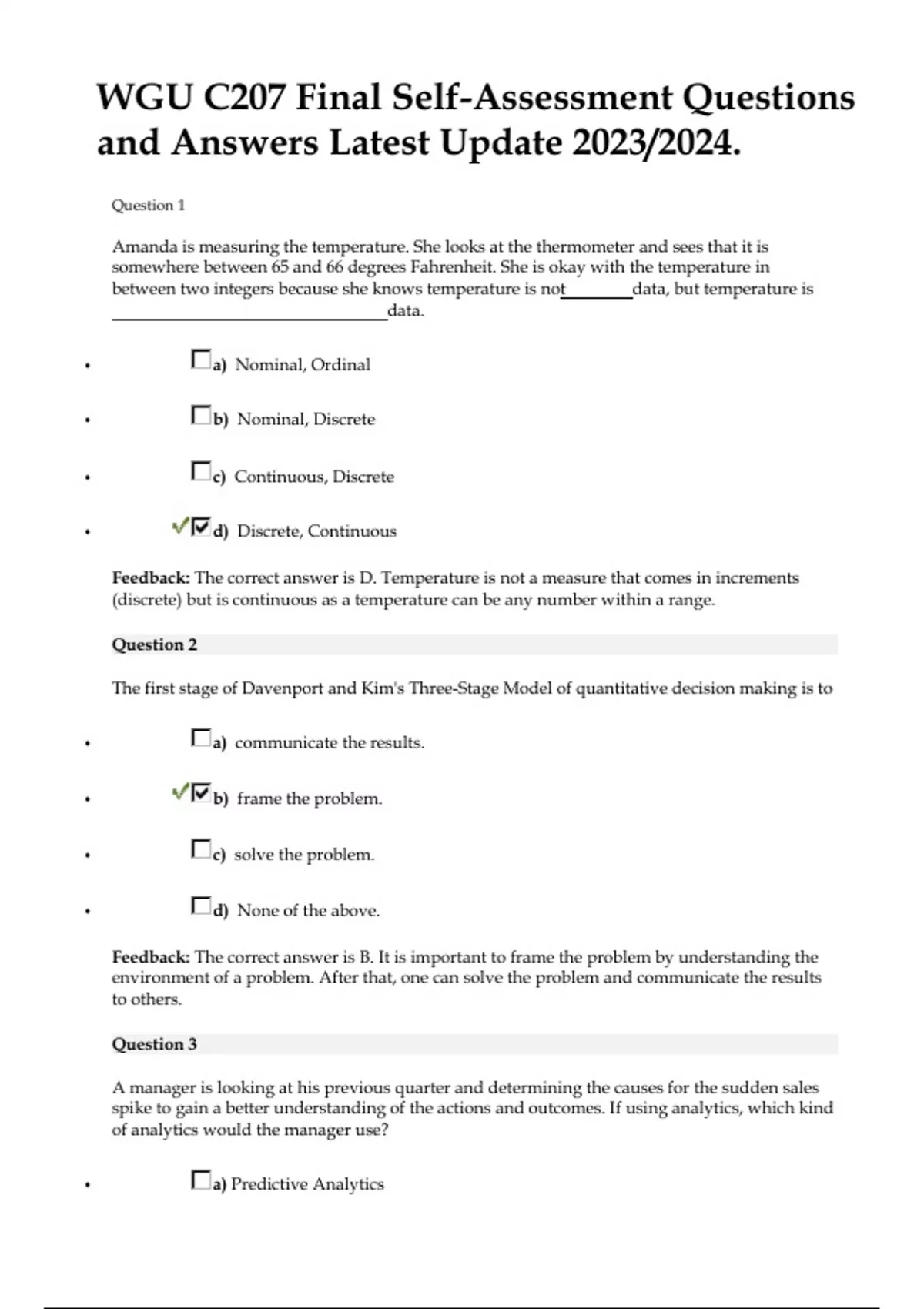 WGU C207 Final Self-Assessment Questions and Answers Latest Update 2023/2024. Question 1 Amanda is measuring the temperature. She looks at the thermometer and sees that it is somewhere between 65 and 66 degrees Fahrenheit. She is okay with the temperature in between two integers because she knows temperature is not data, but temperature is data. • a) Nominal, Ordinal • b) Nominal, Discrete • c) Continuous, Discrete • d) Discrete, Continuous Feedback: The correct answer is D. Temperature is not a measure that comes in increments (discrete) but is continuous as a temperature can be any number within a range. Question 2 The first stage of Davenport and Kim's Three-Stage Model of quantitative decision making is to • a) communicate the results. • b) frame the problem. • c) solve the problem. • d) None of the above. Feedback: The correct answer is B. It is important to frame the problem by understanding the environment of a problem. After that, one can solve the problem and communicate the results to others. Question 3 A manager is looking at his previous quarter and determining the causes for the sudden sales spike to gain a better understanding of the actions and outcomes. If using analytics, which kind of analytics would the manager use? • a) Predictive Analytics • b) Prescriptive Analytics • c) Descriptive Analytics • d) Proactive Analytics Feedback: The correct answer is C. The manager should use descriptive analytics because it is used to describe the characteristics of what is being studied. In this situation, the previous quarter sales would be studied. Question 4 In a study of cancer treatments, the subjects and the treatment allocator (who is also the data gatherer) are unaware of which treatment is being given to which subject. This is a study. • a) Double-Blind • b) Triple-Blind • c) Information-biased • d) Response-biased Feedback: The correct answer is A. There are two layers being blinded in this study. If the treatment allocator and the data gatherer were different people, then this would be a tripleblind study. There is no stated bias. Question 5 Adam is measuring the temperature as the lake outside his office is freezing over. He measures the temperatures in Fahrenheit ten times with the same thermometer and gets the following results: 20, 21, 21, 20, 20, 19, 19, 21, 20, 19. Is his thermometer reliable? Is it valid? • a) Reliable and Valid • b) Reliable but not Valid • c) Not Reliable but Valid • d) Not Reliable or Valid Feedback: The correct answer is B. The thermometer consistently gives about the same number for the freezing point and therefore is reliable. It is not valid because it does not accurately measure what it is trying to measure. We know this because we know water freezes at 32 degrees Fahrenheit. Question 6 Toby is trying to determine the number of people at today's parade in order to determine the impact of advertising at parades. He asks a number of different people leaving the parade their projected number of attendants. He gets the following responses: 70,000; 450,000; 2,000; 130,000; 3,000,000; 75,000; 200,000; 800,000; 150,000; and 210,000. Is this survey reliable? Is it valid? • a) Reliable and Valid • b) Reliable but not Valid • c) Not Reliable but Valid • d) Not Reliable or Valid Feedback: The correct answer is D. The answers are not consistent and do not accurately measure the number of people. Therefore it is not reliable or valid. Question 7 Harry is doing a survey of the city of Los Angeles' population. He is wondering everyone's favorite food. He sends out a survey to all of the renters in the city and receives basically all of the surveys back in the mail. What is the flaw in this experiment? • a) Small Sample Size • b) Blinding • c) Truly Representative Sample • d) Association vs. Causation Feedback: The correct answer is C. This does not represent the entire population that Harry is concluding about as he did not get responses from the other samples such as homeowners in Los Angeles. Question 8 Tom Brady is on the street in Chicago. He is asking anyone he meets if they prefer Tom Brady or Peyton Manning. The survey results show that people greatly prefer Tom Brady. What is the flaw in this experiment? • a) Small Sample Size • b) Truly Representative Sample • c) Response Bias • d) Conscious Bias Feedback: The correct answer is C. It is response bias, as the respondents might be responding believing that Tom Brady wants to hear that they prefer him over Peyton Manning. This is not Conscious bias as conscious bias would be in the way Tom Brady is asking a question and this scenario does not indicate any bias in that way. Question 9 There is a 50 percent chance that the president will slip on a banana peel. Also, there is a 25 percent chance that the president will be hit in the face with an apple. There is a 10 percent chance that the president will slip on a banana peel and get hit in the face with an apple. What is the likelihood that the president has a run-in with at least one of these fruits? • a) 65% • b) 85% • c) 35% • d) 22.50% Feedback: The correct answer is A. This is a union between P(banana) and P(apple). Therefore, P(banana ∪ apple) =P(banana)+P(apple)−P(banana∩apple) =0.50+0.25−0.10=0.65=65% . The president will probably not have a great week. Question 10 There is a 20 percent chance that Charlie's company will merge with another company. If there is a merger, there is an 80 percent chance Charlie will have to fire three people from his team. There is a 15 percent chance Charlie will have to fire three people from his team no matter what. What is the likelihood there will be a merger, and Charlie will have to fire three people from his team? • a) 16% • b) 18% • c) 28% • d) 35% Feedback: The correct answer is A. The probability of a merger is 20 percent (P(merger)=0.20 ), and the probability of Charlie having to fire three people if there is a merg