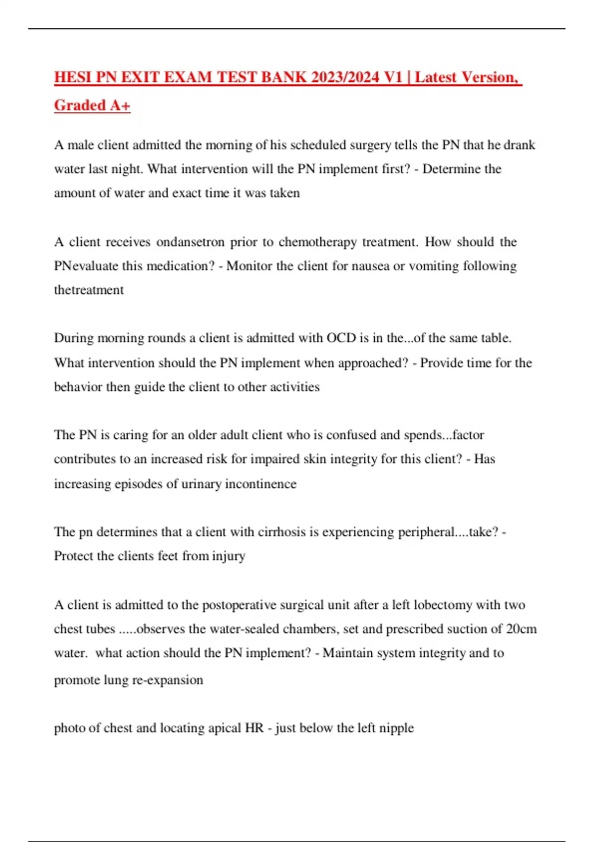 HESI PN EXIT EXAM TEST BANK 2022/2023 V1 | Latest Version, Graded A+ A male client admitted the morning of his scheduled surgery tells the PN that he drank water last night. What intervention will the PN implement first? - Determine the amount of water and exact time it was taken