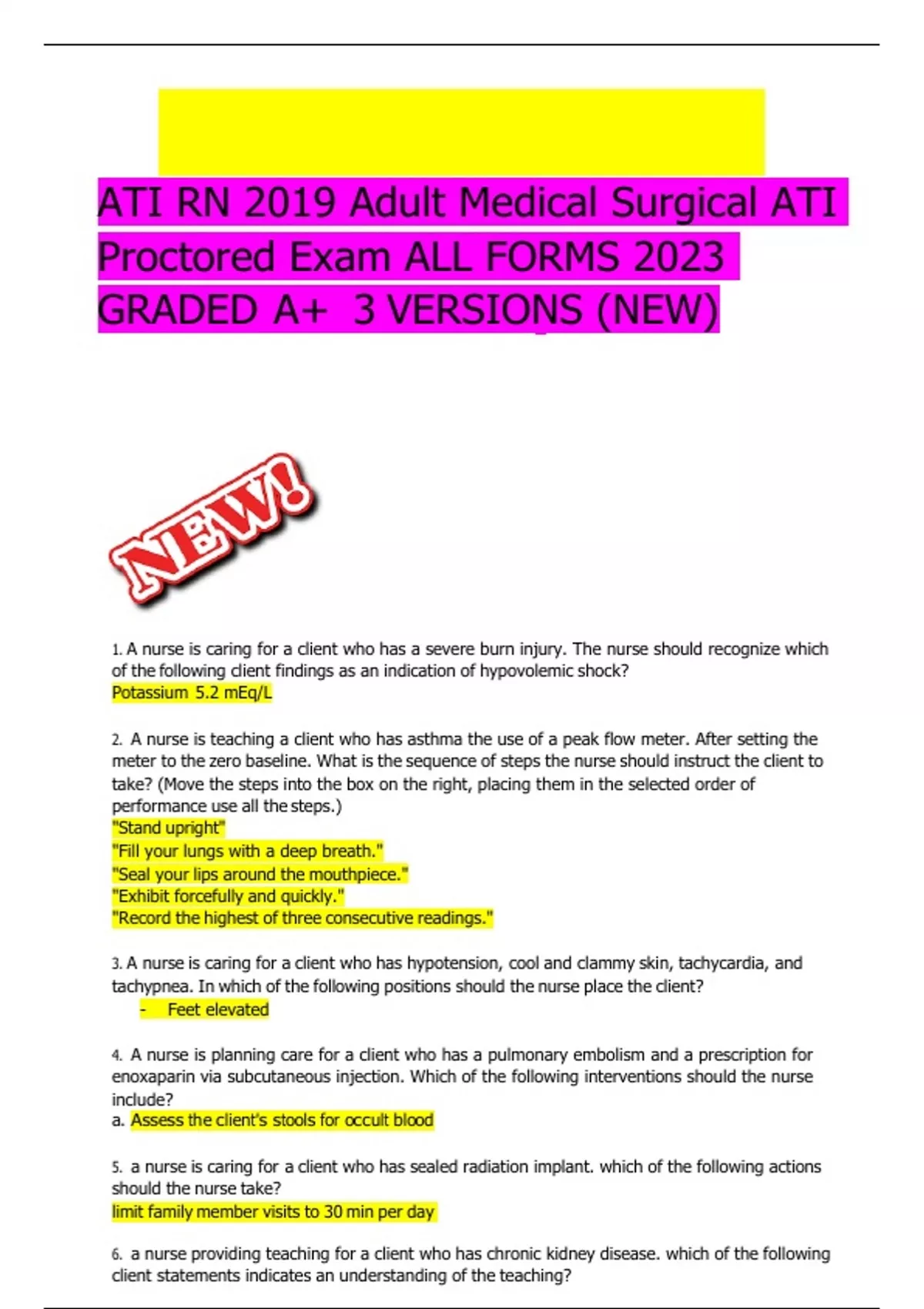 ATI RN 2019 Adult Medical Surgical ATI Proctored Exam ALL FORMS 2023 GRADED A+ 3 VERSIONS (NEW) 1. A nurse is caring for a client who has a severe burn injury. The nurse should recognize which of the following client findings as an indication of hypovolemic shock? Potassium 5.2 mEq/L 2. A nurse is teaching a client who has asthma the use of a peak flow meter. After setting the meter to the zero baseline. What is the sequence of steps the nurse should instruct the client to take? (Move the steps into the box on the right, placing them in the selected order of performance use all the steps.) "Stand upright" "Fill your lungs with a deep breath." "Seal your lips around the mouthpiece." "Exhibit forcefully and quickly." "Record the highest of three consecutive readings." 3. A nurse is caring for a client who has hypotension, cool and clammy skin, tachycardia, and tachypnea. In which of the following positions should the nurse place the client? - Feet elevated 4. A nurse is planning care for a client who has a pulmonary embolism and a prescription for enoxaparin via subcutaneous injection. Which of the following interventions should the nurse include? a. Assess the client‟s stools for occult blood 5. a nurse is caring for a client who has sealed radiation implant. which of the following actions should the nurse take? 6. a nurse providing teaching for a client who has chronic kidney disease. which of the following client statements indicates an understanding of the teaching? a. I will spread my protein allowances over the entire day 7. A nurse is caring for a client who is 2 days postoperative following abdominal surgery and has a prescription for opioid analgesia. Which of the following actions should the nurse implement to help facilitate the client's recovery? Provide analgesic medication prior to physical activities. 8. A the medical record of a client who is 1 day postoperative following an appendectomy. Which of the following should the nurse report to the provider ?