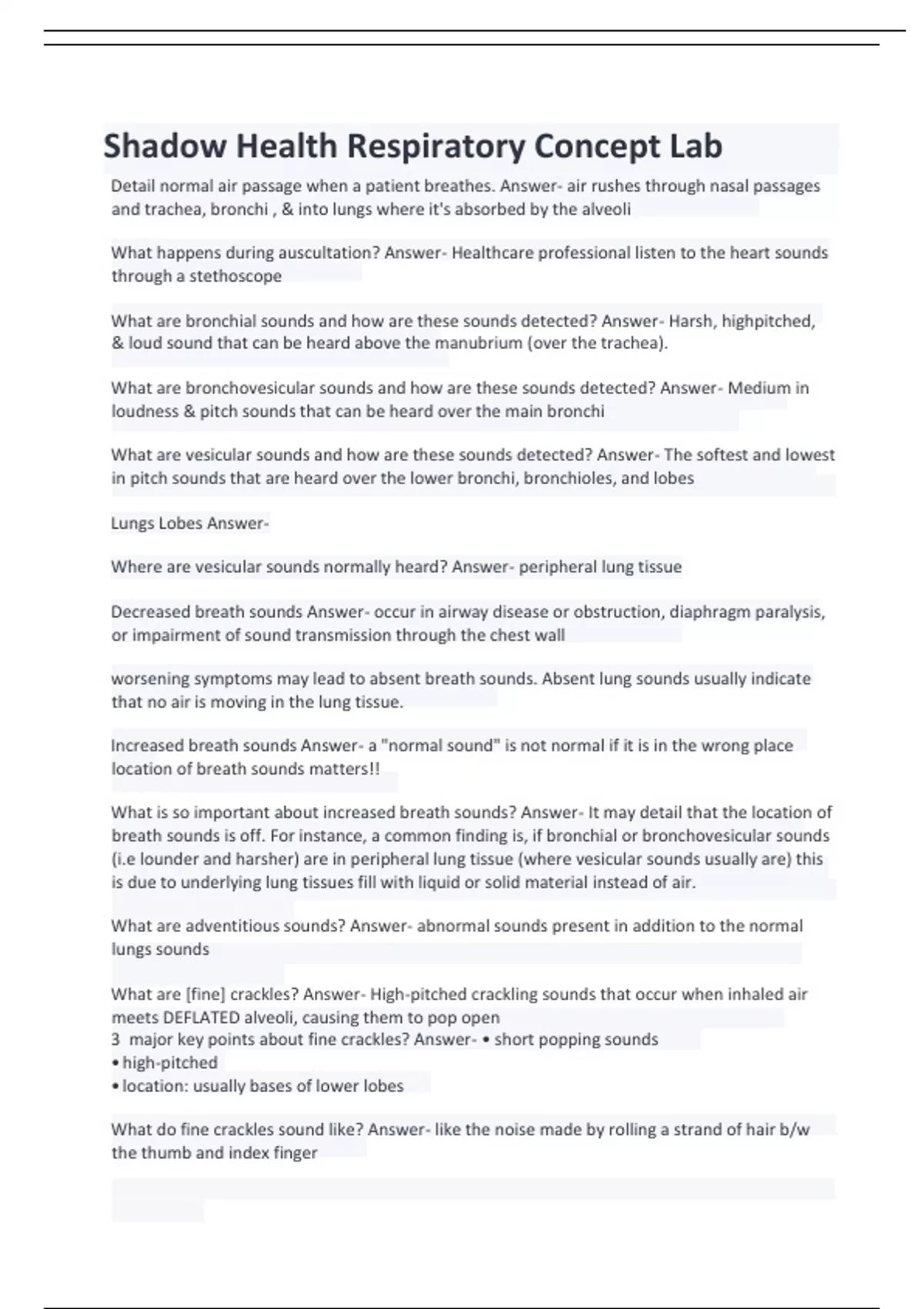 Detail normal air passage when a patient breathes. Answer- air rushes through nasal passages and trachea, bronchi , & into lungs where it's absorbed by the alveoli What happens during auscultation? Answer- Healthcare professional listen to the heart sounds through a stethoscope What are bronchial sounds and how are these sounds detected? Answer- Harsh, highpitched, & loud sound that can be heard above the manubrium (over the trachea). What are bronchovesicular sounds and how are these sounds detected? Answer- Medium in loudness & pitch sounds that can be heard over the main bronchi What are vesicular sounds and how are these sounds detected? Answer- The softest and lowest in pitch sounds that are heard over the lower bronchi, bronchioles, and lobes Lungs Lobes AnswerWhere are vesicular sounds normally heard? Answer- peripheral lung tissue Decreased breath sounds Answer- occur in airway disease or obstruction, diaphragm paralysis, or impairment of sound transmission through the chest wal