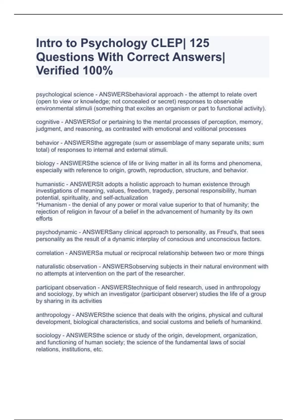 psychological science - ANSWERSbehavioral approach - the attempt to relate overt (open to view or knowledge; not concealed or secret) responses to observable environmental stimuli (something that excites an organism or part to functional activity). cognitive - ANSWERSof or pertaining to the mental processes of perception, memory, judgment, and reasoning, as contrasted with emotional and volitional processes behavior - ANSWERSthe aggregate (sum or assemblage of many separate units; sum total) of responses to internal and external stimuli. biology - ANSWERSthe science of life or living matter in all its forms and phenomena, especially with reference to origin, growth, reproduction, structure, and behavior. humanistic - ANSWERSIt adopts a holistic approach to human existence through investigations of meaning, values, freedom, tragedy, personal responsibility, human potential, spirituality, and self-actualization *Humanism - the denial of any power or moral value superior to that of humanity; the rejection of religion in favour of a belief in the advancement of humanity by its own efforts psychodynamic - ANSWERSany clinical approach to personality, as Freud's, that sees personality as the result of a dynamic interplay of conscious and unconscious factors. Intro to Psychology CLEP| 125 Questions With Correct Answers| Verified 100% Intro to Psychology CLEP| 125 Questions With Correct Answers| Verified 100%