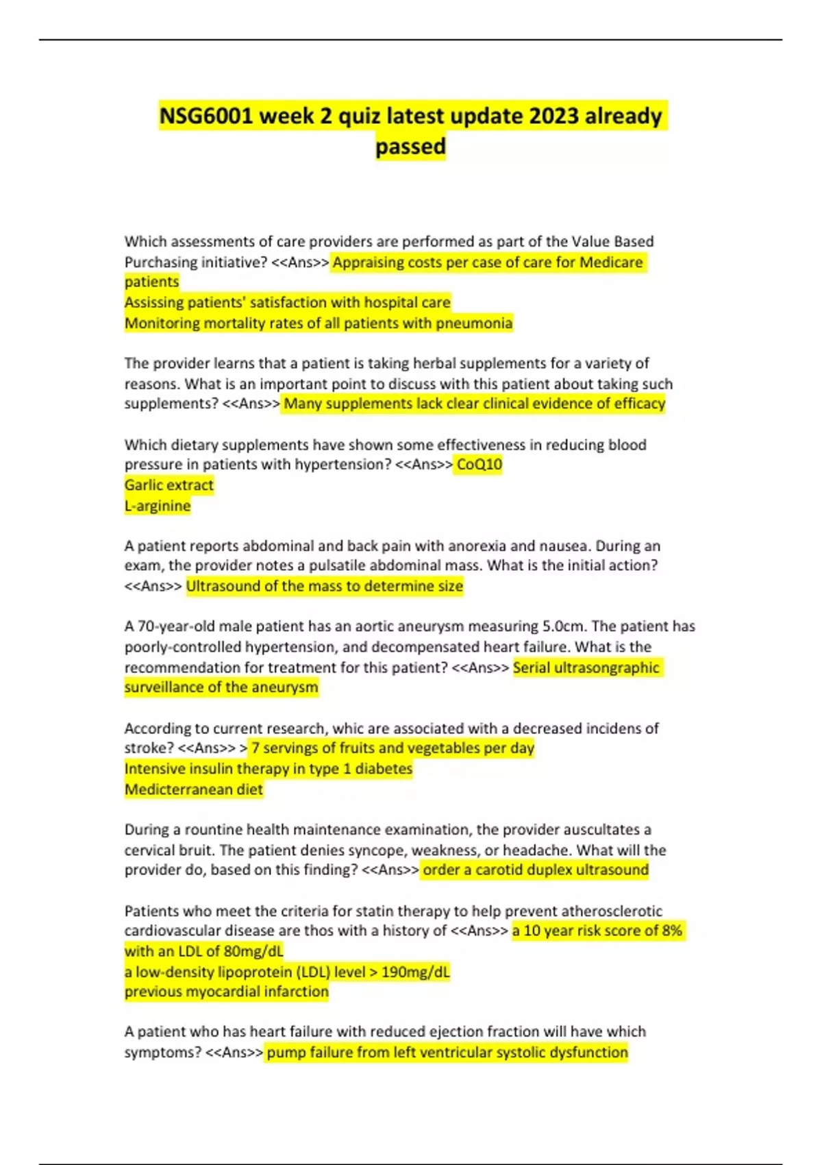 Which assessments of care providers are performed as part of the Value Based Purchasing initiative? <<Ans>> Appraising costs per case of care for Medicare patients Assissing patients' satisfaction with hospital care Monitoring mortality rates of all patients with pneumonia The provider learns that a patient is taking herbal supplements for a variety of reasons. What is an important point to discuss with this patient about taking such supplements? <<Ans>> Many supplements lack clear clinical evidence of efficacy Which dietary supplements have shown some effectiveness in reducing blood pressure in patients with hypertension? <<Ans>> CoQ10 Garlic extract L-arginine A patient reports abdominal and back pain with anorexia and nausea. During an exam, the provider notes a pulsatile abdominal mass. What is the initial action? <<Ans>> Ultrasound of the mass to determine size A 70-year-old male patient has an aortic aneurysm measuring 5.0cm. The patient has poorly-controlled hypertension, and decompensated heart failure. What is the recommendation for treatment for this patient? <<Ans>> Serial ultrasongraphic surveillance of the aneurysm According to current research, whic are associated with a decreased incidens of stroke? <<Ans>> > 7 servings of fruits and vegetables per day Intensive insulin therapy in type 1 diabetes Medicterranean diet During a rountine health maintenance examination, the provider auscultates a cervical bruit. The patient denies syncope, weakness, or headache. What will the provider do, based on this finding? <<Ans>> order a carotid duplex ultrasound Patients who meet the criteria for statin therapy to help prevent atherosclerotic cardiovascular disease are thos with a history of <<Ans>> a 10 year risk score of 8% with an LDL of 80mg/dL a low-density lipoprotein (LDL) level > 190mg/dL previous myocardial infarction A patient who has heart failure with reduced ejection fraction will have which symptoms? <<Ans>> pump failure from left ventricular systolic dysfunction A patient who has been diagnosed with heart failure for over a year reports being comfortable while at rest and experiences palpitaitons and dyspnea when walking tothe bathroom. Which classification of heart failure is appropriate based on these symptoms? <<Ans>> Class II A patient who has class II heart failure is taking an ACE inhibitor and reports a recurrent cough that does not interfere with sleep or activity. What will the provider do intitaly to manage this patient? <<Ans>> Provide reassurance that this is a benign side effect