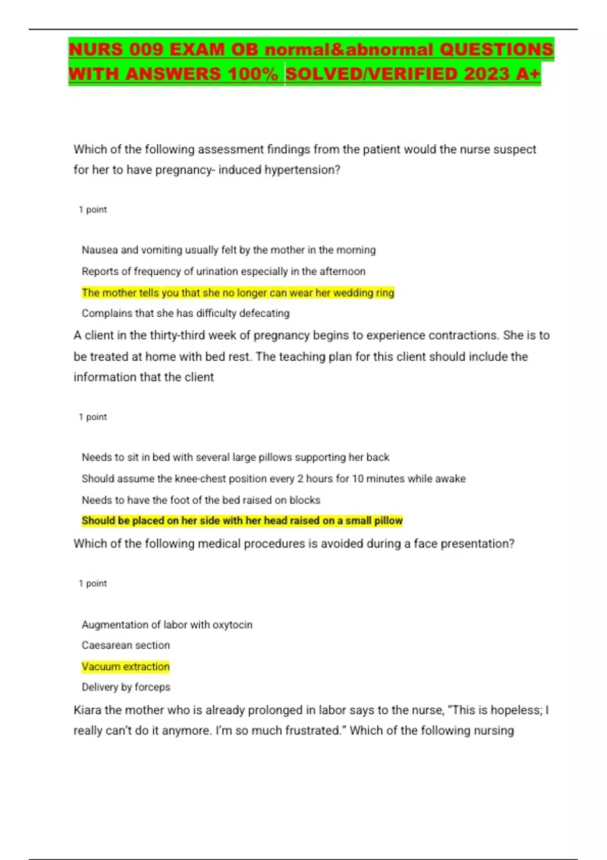 nurs 009 exam ob normalampabnormal questions with an