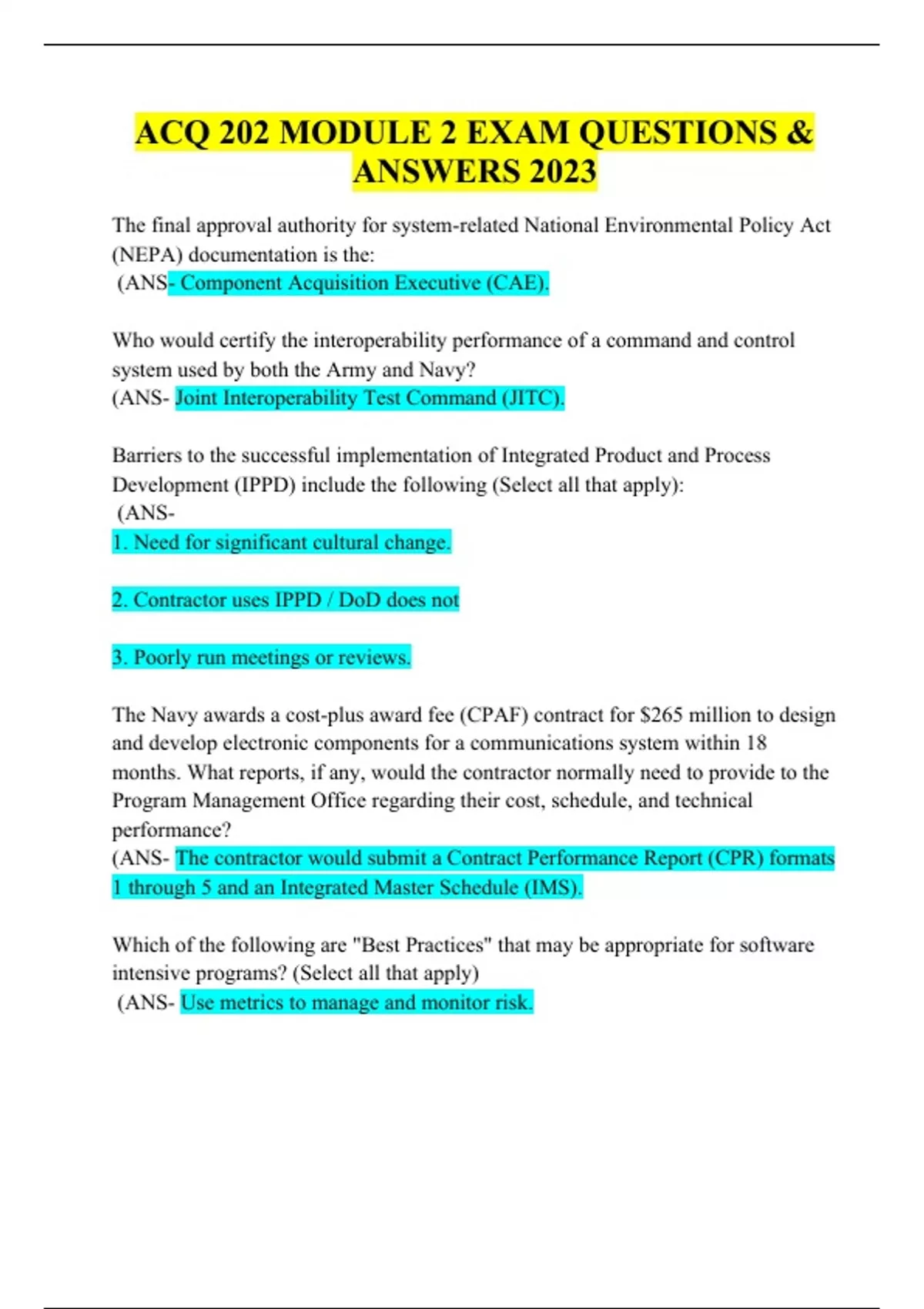 ACQ 202 MODULE 2 EXAM QUESTIONS & ANSWERS 2023 ACQ 202 MODULE 2 EXAM QUESTIONS & ANSWERS 2023 The final approval authority for system-related National Environmental Policy Act (NEPA) documentation is the: (ANS- Component Acquisition Executive (CAE). Who would certify the interoperability performance of a command and control system used by both the Army and Navy? (ANS- Joint Interoperability Test Command (JITC). Barriers to the successful implementation of Integrated Product and Process Development (IPPD) include the following (Select all that apply): (ANS- 1. Need for significant cultural change. 2. Contractor uses IPPD / DoD does not 3. Poorly run meetings or reviews. The Navy awards a cost-plus award fee (CPAF) contract for $265 million to design and develop electronic components for a communications system within 18 months. What reports, if any, would the contractor normally need to provide to the Program Management Office regarding their cost, schedule, and technical performance? (ANS- The contractor would submit a Contract Performance Report (CPR) formats 1 through 5 and an Integrated Master Schedule (IMS). Which of the following are "Best Practices" that may be appropriate for software intensive programs? (Select all that apply) (ANS- Use metrics to manage and monitor risk.