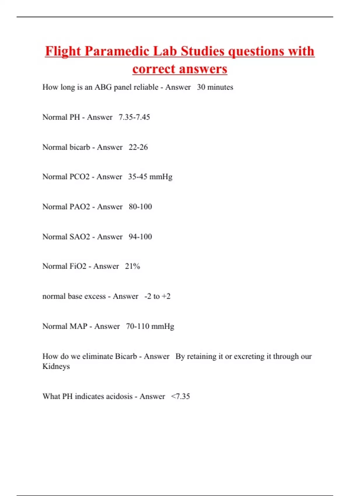 How long is an ABG panel reliable - Answer 30 minutes Normal PH - Answer 7.35-7.45 Normal bicarb - Answer 22-26 Normal PCO2 - Answer 35-45 mmHg Normal PAO2 - Answer 80-100 Normal SAO2 - Answer 94-100 Normal FiO2 - Answer 21% normal base excess - Answer -2 to +2 Normal MAP - Answer 70-110 mmHg How do we eliminate Bicarb - Answer By retaining it or excreting it through our Kidneys What PH indicates acidosis - Answer