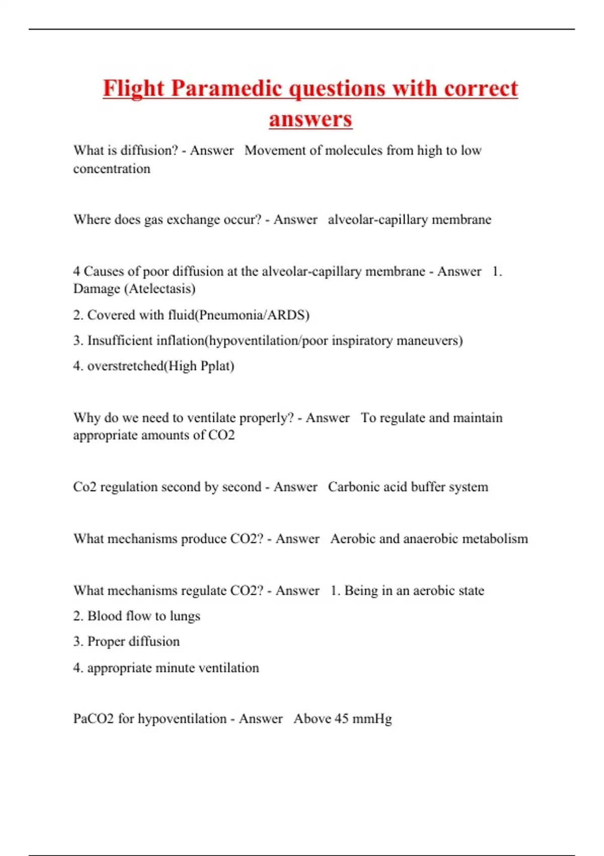 What is diffusion? - Answer Movement of molecules from high to low concentration Where does gas exchange occur? - Answer alveolar-capillary membrane 4 Causes of poor diffusion at the alveolar-capillary membrane - Answer 1. Damage (Atelectasis) 2. Covered with fluid(Pneumonia/ARDS) 3. Insufficient inflation(hypoventilation/poor inspiratory maneuvers) 4. overstretched(High Pplat) Why do we need to ventilate properly? - Answer To regulate and maintain appropriate amounts of CO2 Co2 regulation second by second - Answer Carbonic acid buffer system What mechanisms produce CO2? - Answer Aerobic and anaerobic metabolism What mechanisms regulate CO2? - Answer 1. Being in an aerobic state 2. Blood flow to lungs 3. Proper diffusion 4. appropriate minute ventilation