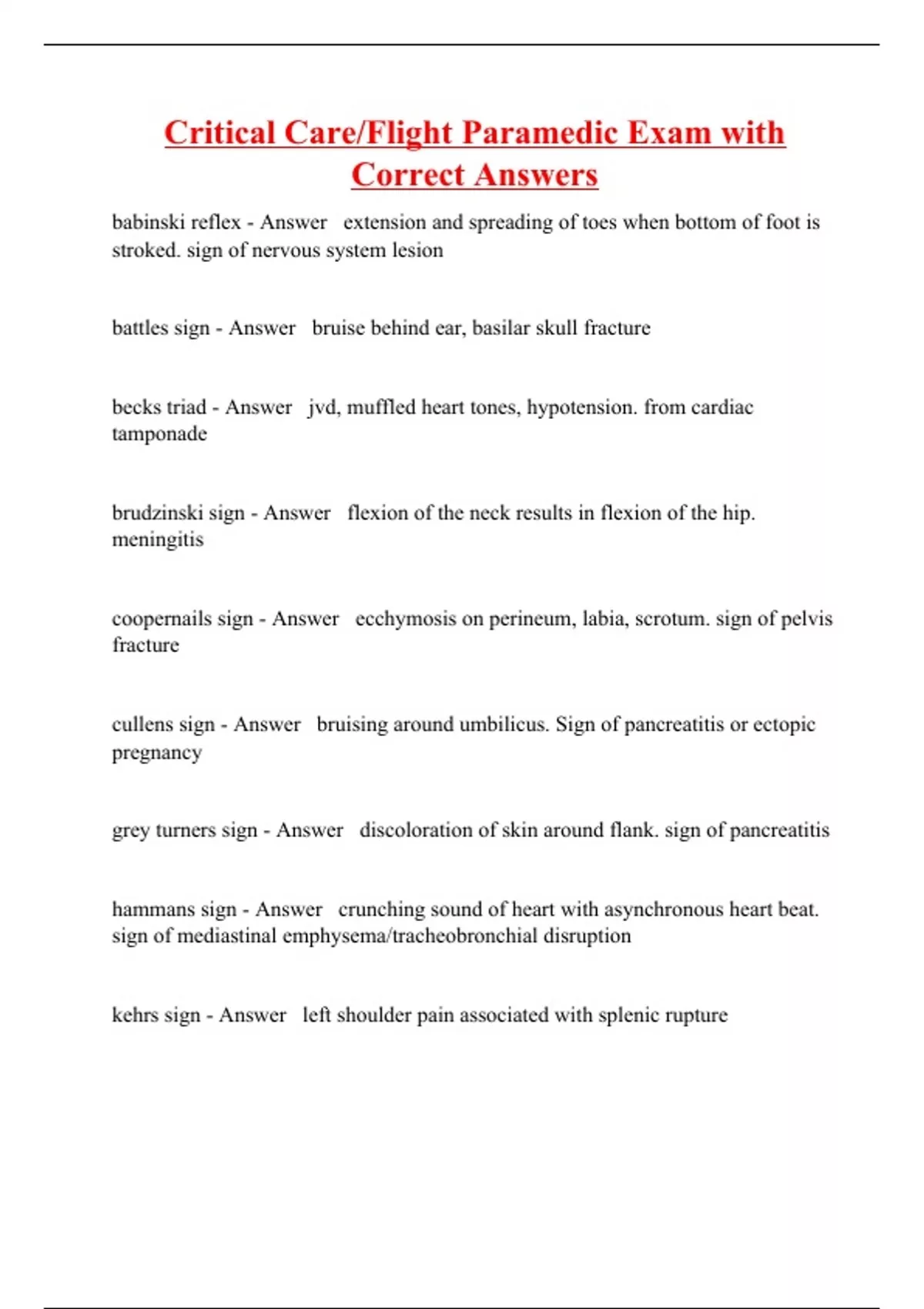 babinski reflex - Answer extension and spreading of toes when bottom of foot is stroked. sign of nervous system lesion battles sign - Answer bruise behind ear, basilar skull fracture becks triad - Answer jvd, muffled heart tones, hypotension. from cardiac tamponade brudzinski sign - Answer flexion of the neck results in flexion of the hip. meningitis coopernails sign - Answer ecchymosis on perineum, labia, scrotum. sign of pelvis fracture cullens sign - Answer bruising around umbilicus. Sign of pancreatitis or ectopic pregnancy grey turners sign - Answer discoloration of skin around flank. sign of pancreatitis hammans sign - Answer crunching sound of heart with asynchronous heart beat. sign of mediastinal emphysema/tracheobronchial disruption kehrs sign - Answer left shoulder pain associated with splenic rupture