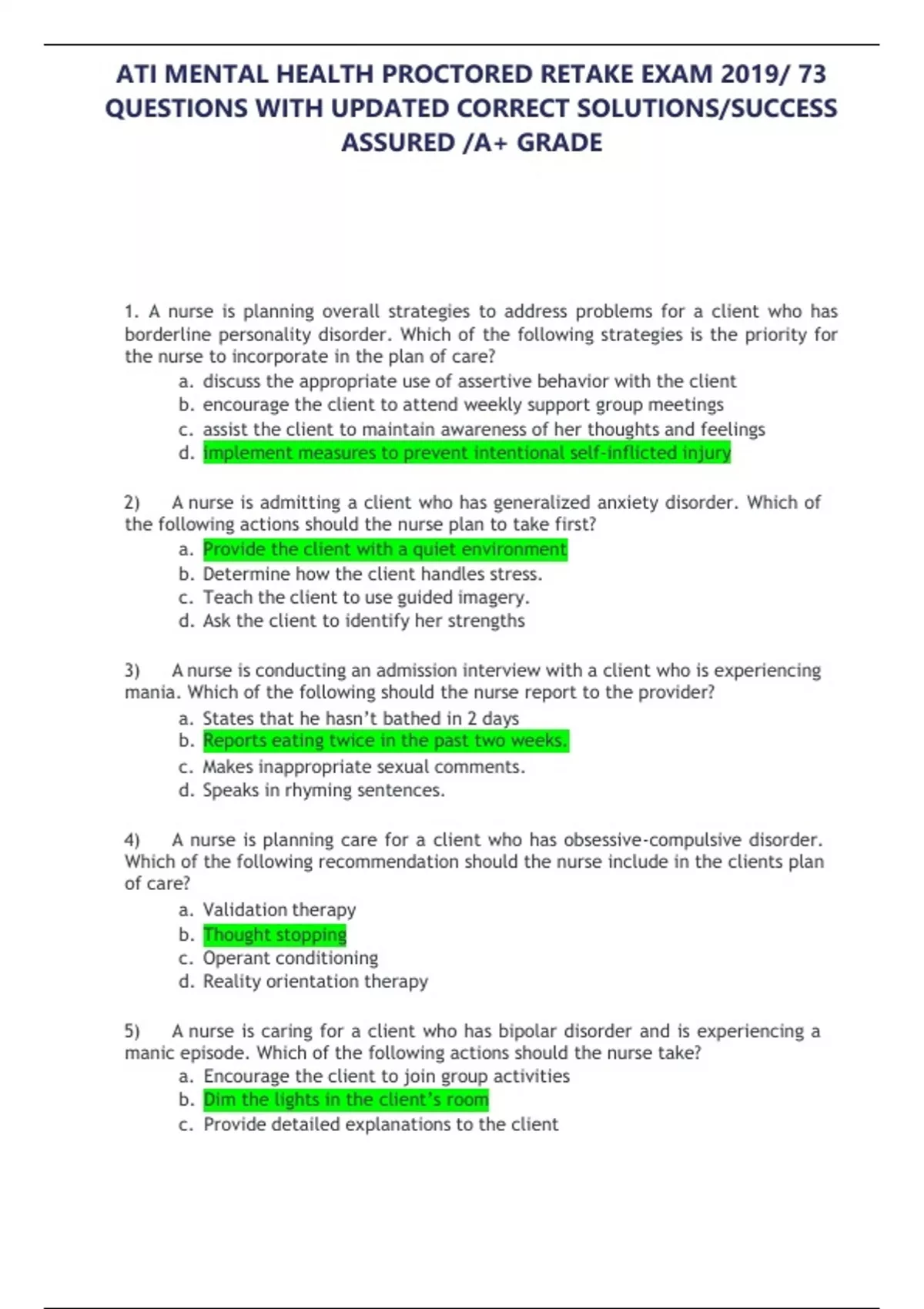 ATI MENTAL HEALTH PROCTORED RETAKE EXAM 2019/ 73 QUESTIONS WITH UPDATED CORRECT SOLUTIONS/SUCCESS ASSURED /A+ GRADE 1. A nurse is planning overall strategies to address problems for a client who has borderline personality disorder. Which of the following strategies is the priority for the nurse to incorporate in the plan of care? a. discuss the appropriate use of assertive behavior with the client b. encourage the client to attend weekly support group meetings c. assist the client to maintain awareness of her thoughts and feelings d. implement measures to prevent intentional self-inflicted injury 2) A nurse is admitting a client who has generalized anxiety disorder. Which of the following actions should the nurse plan to take first? a. Provide the client with a quiet environment b. Determine how the client handles stress. c. Teach the client to use guided imagery. d. Ask the client to identify her strengths 3) A nurse is conducting an admission interview with a client who is experiencing mania. Which of the following should the nurse report to the provider? a. States that he hasn’t bathed in 2 days b. Reports eating twice in the past two weeks. c. Makes inappropriate sexual comments. d. Speaks in rhyming sentences. 4) A nurse is planning care for a client who has obsessive-compulsive disorder. Which of the following recommendation should the nurse include in the clients plan of care? a. Validation therapy b. Thought stopping c. Operant conditioning d. Reality orientation therapy 5) A nurse is caring for a client who has bipolar disorder and is experiencing a manic episode. Which of the following actions should the nurse take? a. Encourage the client to join group activities b. Dim the lights in the client’s room c. Provide detailed explanations to the client ATI MENTAL HEALTH PROCTORED RETAKE EXAM 2019/ 73 QUESTIONS WITH UPDATED CORRECT SOLUTIONS/SUCCESS ASSURED /A+ GR