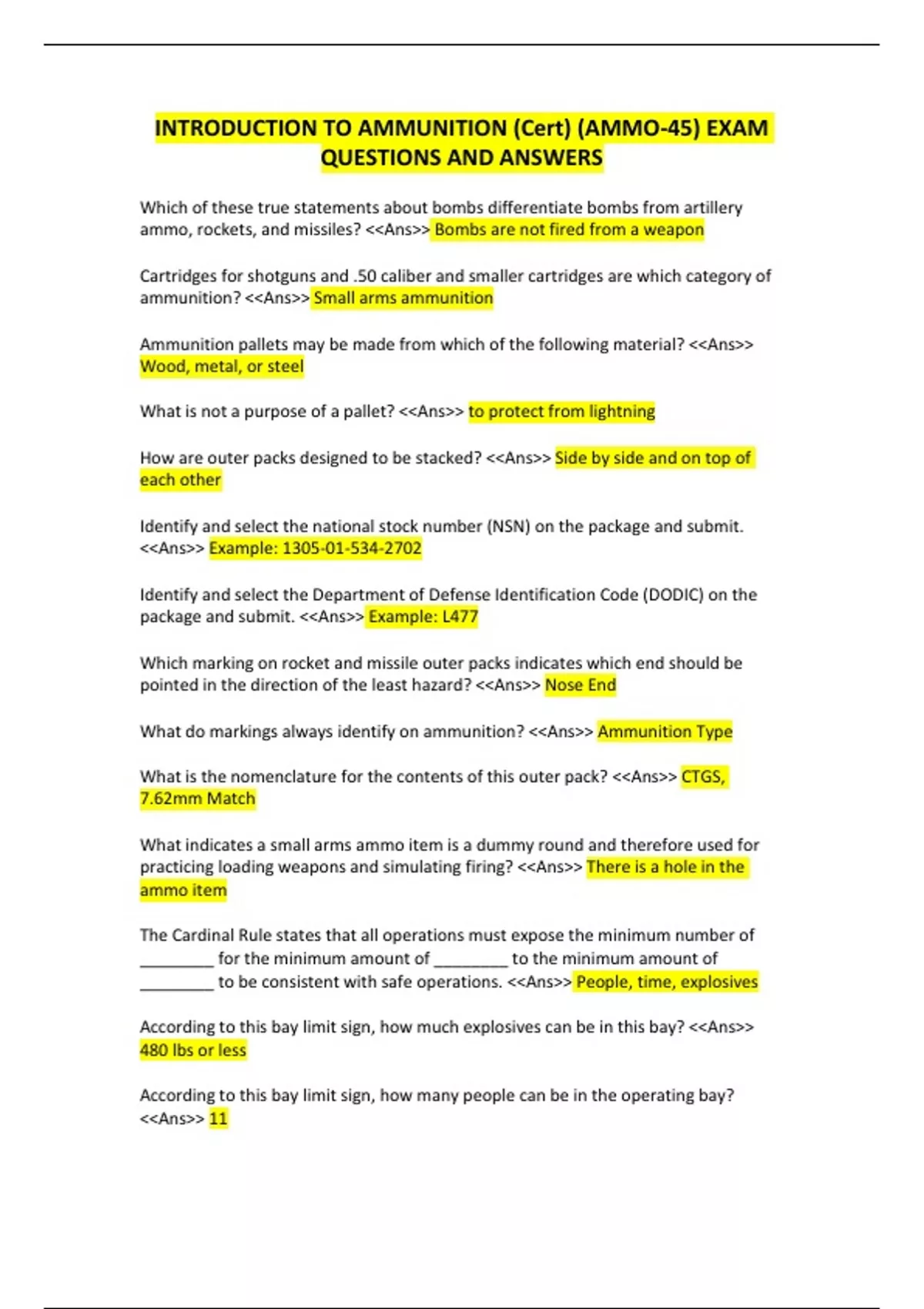 INTRODUCTION TO AMMUNITION (Cert) (AMMO-45) EXAM QUESTIONS AND ANSWERS