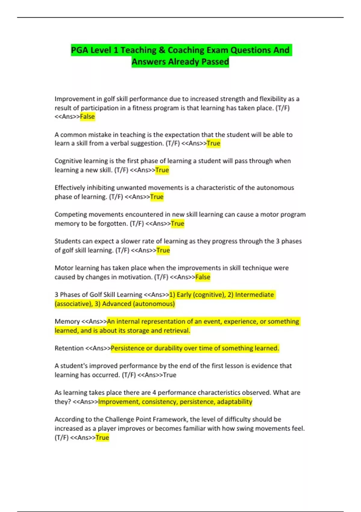 PGA Level 1 Teaching & Coaching Exam Questions And Answers Already Passed