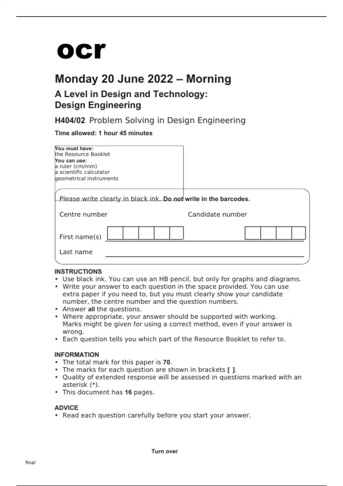 ocr A Level in Design and Technology Design Engineering H404-02 Question Paper June 2022