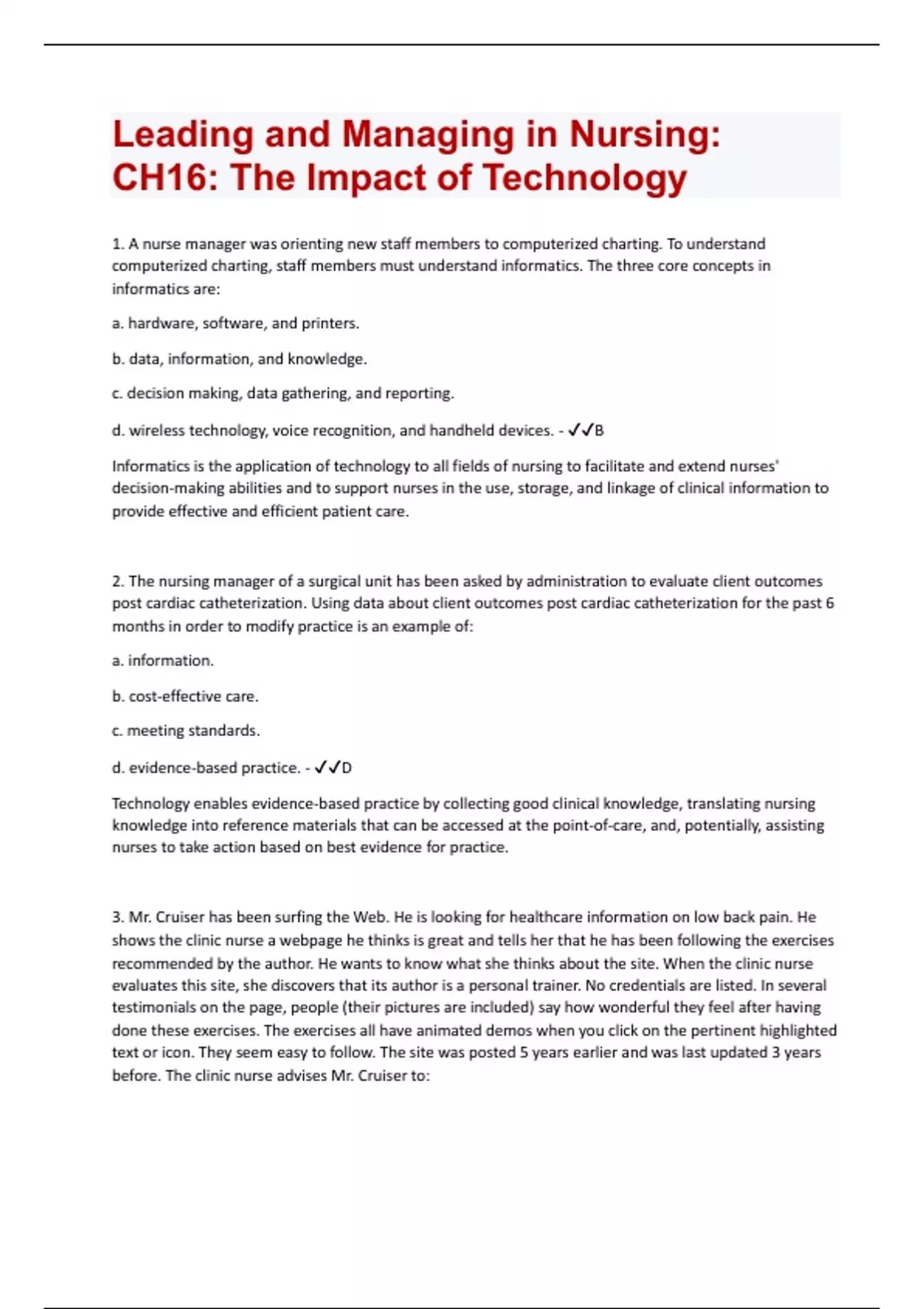 1. A nurse manager was orienting new staff members to computerized charting. To understand computerized charting, staff members must understand informatics. The three core concepts in informatics are: a. hardware, software, and printers. b. data, information, and knowledge. c. decision making, data gathering, and reporting. d. wireless technology, voice recognition, and handheld devices. - B Informatics is the application of technology to all fields of nursing to facilitate and extend nurses' decision-making abilities and to support nurses in the use, storage, and linkage of clinical information to provide effective and efficient patient care. 2. The nursing manager of a surgical unit has been asked by administration to evaluate client outcomes post cardiac catheterization. Using data about client outcomes post cardiac catheterization for the past 6 months in order to modify practice is an example of: a. information. b. cost-effective care. c. meeting standards. d. evidence-based practice. - D Technology enables evidence-based practice by collecting good clinical knowledge, translating nursing knowledge into reference materials that can be accessed at the point-of-care, and, potentially, assisting nurses to take action based on best evidence for practice. 3. Mr. Cruiser has been surfing the Web. He is looking for healthcare information on low back pain. He shows the clinic nurse a webpage he thinks is great and tells her that he has been following the exercises recommended by the author. He wants to know what she thinks about the site. When the clinic nurse evaluates this site, she discovers that its author is a personal trainer. No credentials are listed. In several testimonials on the page, people (their pictures are included) say how wonderful they feel after having done these exercises. The exercises all have animated demos when you click on the pertinent highlighted text or icon. They seem easy to follow. The site was posted 5 years earlier and was last updated 3 years before. The clinic nurse advises Mr. Cruiser to:a. avoid this site. b. check with his primary healthcare provider. c. continue with the exercises. d. contact the author for additional exercise and feedback. - ANS: A