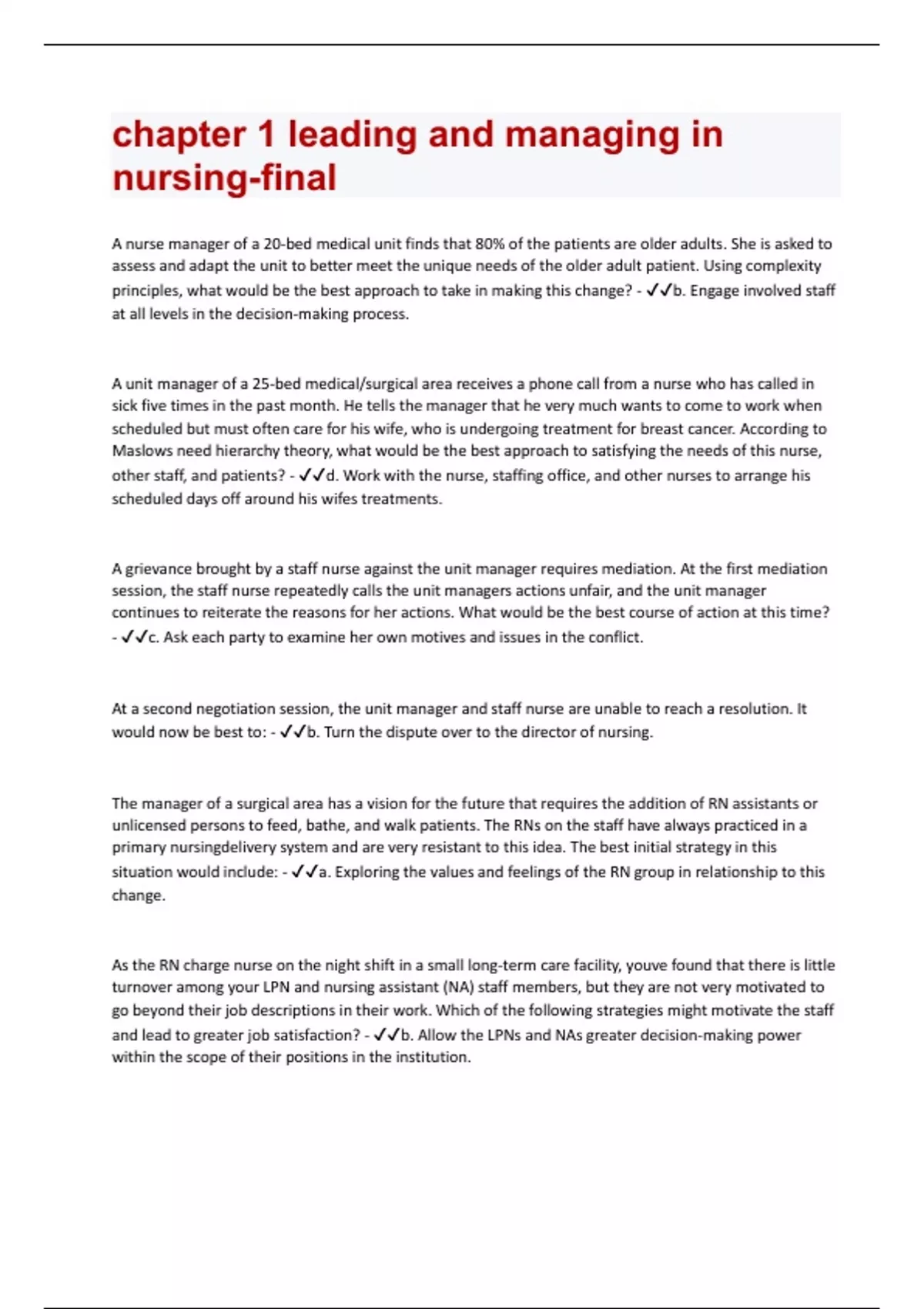 A nurse manager of a 20-bed medical unit finds that 80% of the patients are older adults. She is asked to assess and adapt the unit to better meet the unique needs of the older adult patient. Using complexity principles, what would be the best approach to take in making this change? - b. Engage involved staff at all levels in the decision-making process. A unit manager of a 25-bed medical/surgical area receives a phone call from a nurse who has called in sick five times in the past month. He tells the manager that he very much wants to come to work when scheduled but must often care for his wife, who is undergoing treatment for breast cancer. According to Maslows need hierarchy theory, what would be the best approach to satisfying the needs of this nurse, other staff, and patients? - d. Work with the nurse, staffing office, and other nurses to arrange his scheduled days off around his wifes treatments. A grievance brought by a staff nurse against the unit manager requires mediation. At the first mediation session, the staff nurse repeatedly calls the unit managers actions unfair, and the unit manager continues to reiterate the reasons for her actions. What would be the best course of action at this time? - c. Ask each party to examine her own motives and issues in the conflict. At a second negotiation session, the unit manager and staff nurse are unable to reach a resolution. It would now be best to: - b. Turn the dispute over to the director of nursing. The manager of a surgical area has a vision for the future that requires the addition of RN assistants or unlicensed persons to feed, bathe, and walk patients. The RNs on the staff have always practiced in a primary nursingdelivery system and are very resistant to this idea. The best initial strategy in this situation would include: - a. Exploring the values and feelings of the RN group in relationship to this change. As the RN charge nurse on the night shift in a small long-term care facility, youve found that there is little turnover among your LPN and nursing assistant (NA) staff members, but they are not very motivated to go beyond their job descriptions in their work. Which of the following strategies might motivate the staff and lead to greater job satisfaction? - b. Allow the LPNs and NAs greater decision-making power within the scope of their positions in the institution.