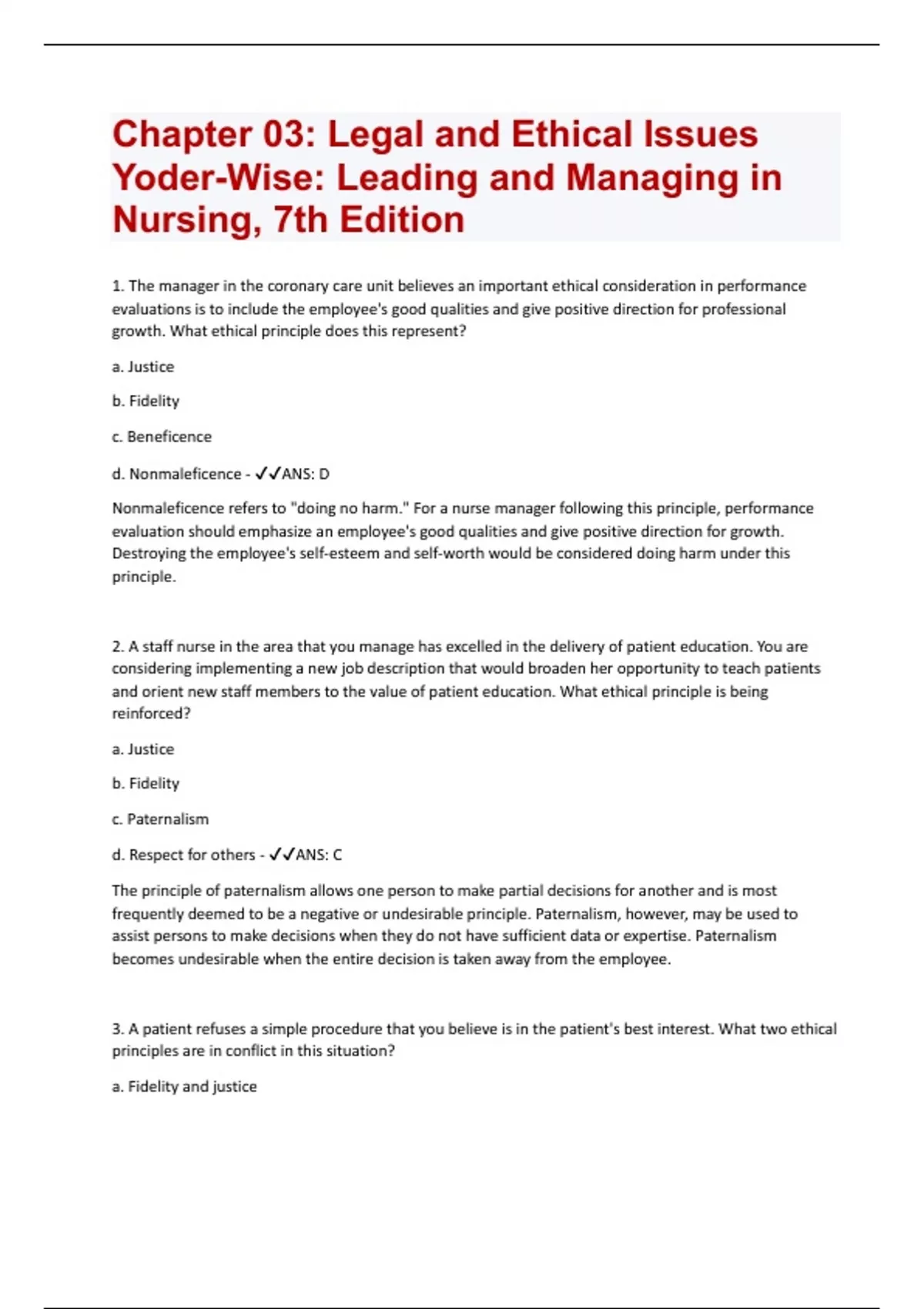 1. The manager in the coronary care unit believes an important ethical consideration in performance evaluations is to include the employee's good qualities and give positive direction for professional growth. What ethical principle does this represent? a. Justice b. Fidelity c. Beneficence d. Nonmaleficence - ANS: D Nonmaleficence refers to "doing no harm." For a nurse manager following this principle, performance evaluation should emphasize an employee's good qualities and give positive direction for growth. Destroying the employee's self-esteem and self-worth would be considered doing harm under this principle. 2. A staff nurse in the area that you manage has excelled in the delivery of patient education. You are considering implementing a new job description that would broaden her opportunity to teach patients and orient new staff members to the value of patient education. What ethical principle is being reinforced? a. Justice b. Fidelity c. Paternalism d. Respect for others - ANS: C The principle of paternalism allows one person to make partial decisions for another and is most frequently deemed to be a negative or undesirable principle. Paternalism, however, may be used to assist persons to make decisions when they do not have sufficient data or expertise. Paternalism becomes undesirable when the entire decision is taken away from the employee. 3. A patient refuses a simple procedure that you believe is in the patient's best interest. What two ethical principles are in conflict in this situation? a. Fidelity and justiceb. Veracity and fidelity c. Autonomy and beneficence d. Paternalism and respect for others - ANS: C