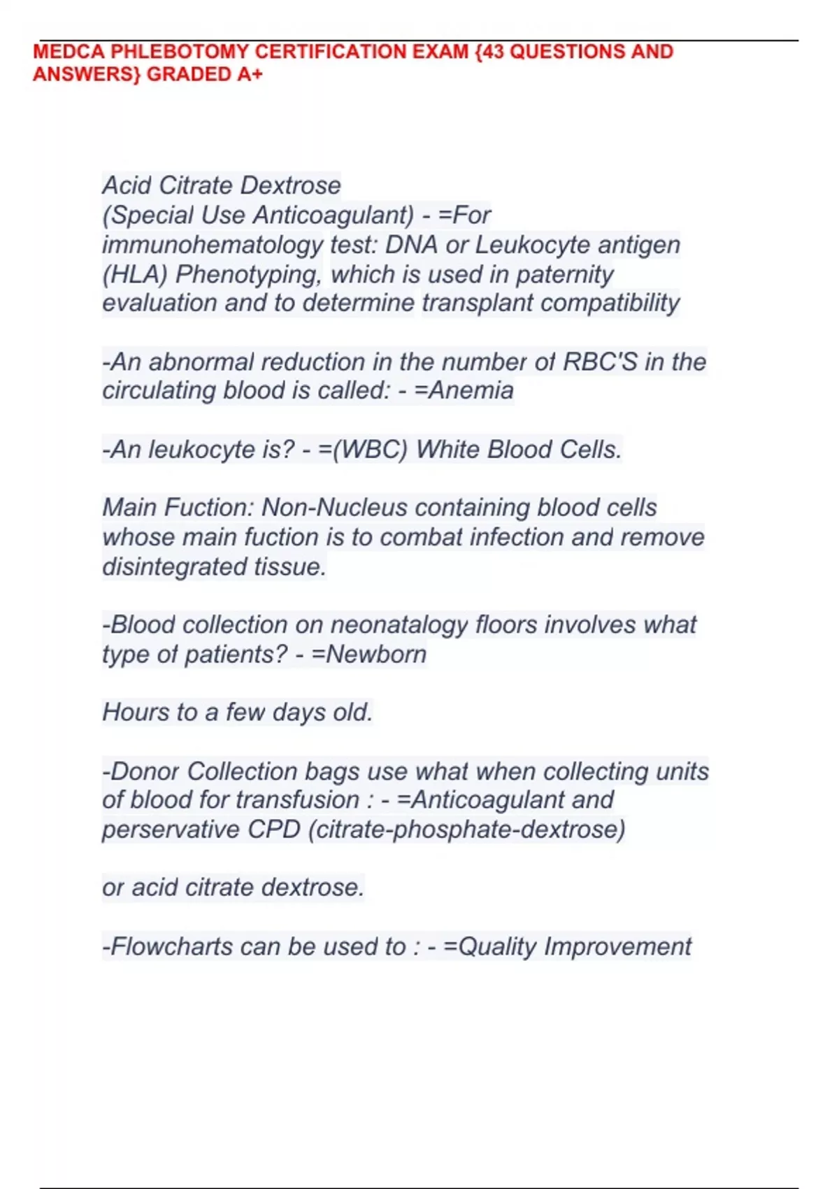 MEDCA PHLEBOTOMY CERTIFICATION EXAM {43 QUESTIONS AND ANSWERS} GRADED A+