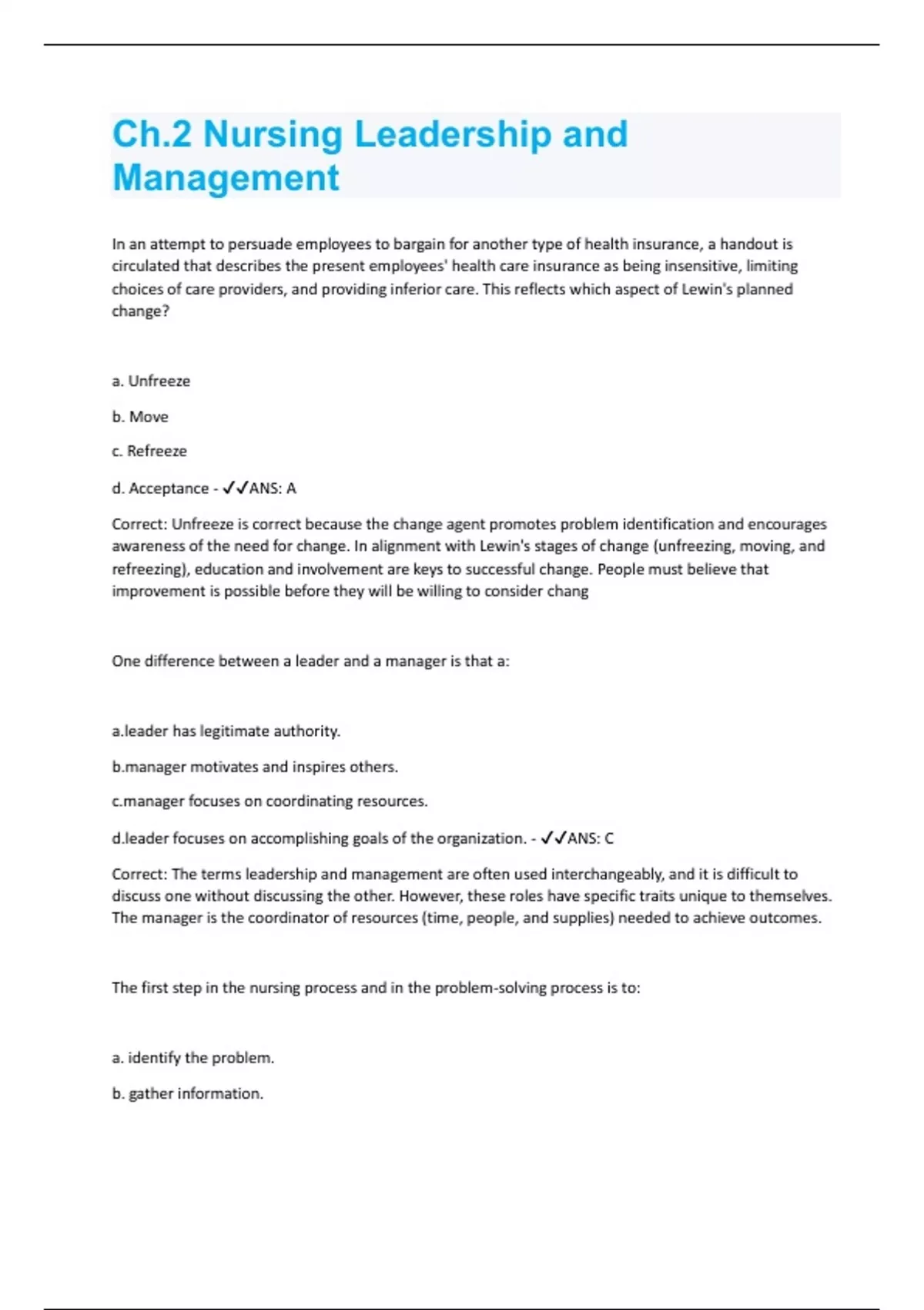 In an attempt to persuade employees to bargain for another type of health insurance, a handout is circulated that describes the present employees' health care insurance as being insensitive, limiting choices of care providers, and providing inferior care. This reflects which aspect of Lewin's planned change? a. Unfreeze b. Move c. Refreeze d. Acceptance - ANS: A Correct: Unfreeze is correct because the change agent promotes problem identification and encourages awareness of the need for change. In alignment with Lewin's stages of change (unfreezing, moving, and refreezing), education and involvement are keys to successful change. People must believe that improvement is possible before they will be willing to consider chang One difference between a leader and a manager is that a: r has legitimate authority. er motivates and inspires others. er focuses on coordinating resources. r focuses on accomplishing goals of the organization. - ANS: C Correct: The terms leadership and management are often used interchangeably, and it is difficult to discuss one without discussing the other. However, these roles have specific traits unique to themselves. The manager is the coordinator of resources (time, people, and supplies) needed to achieve outcomes. The first step in the nursing process and in the problem-solving process is to: a. identify the problem. b. gather information.c. consider the consequences. d. implement interventions. - ANS: B